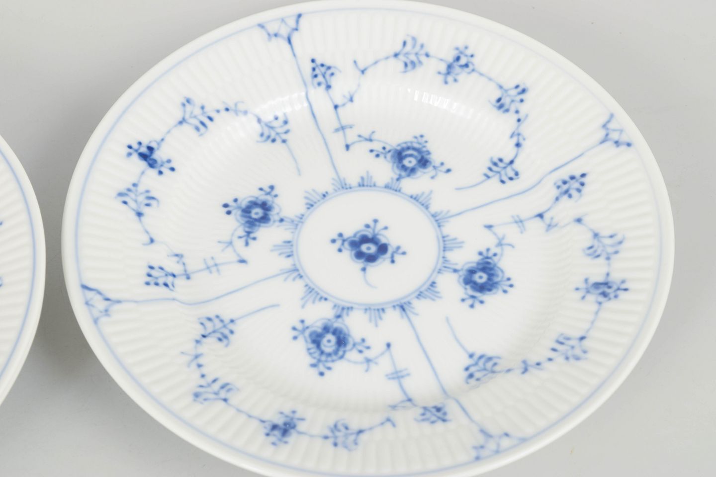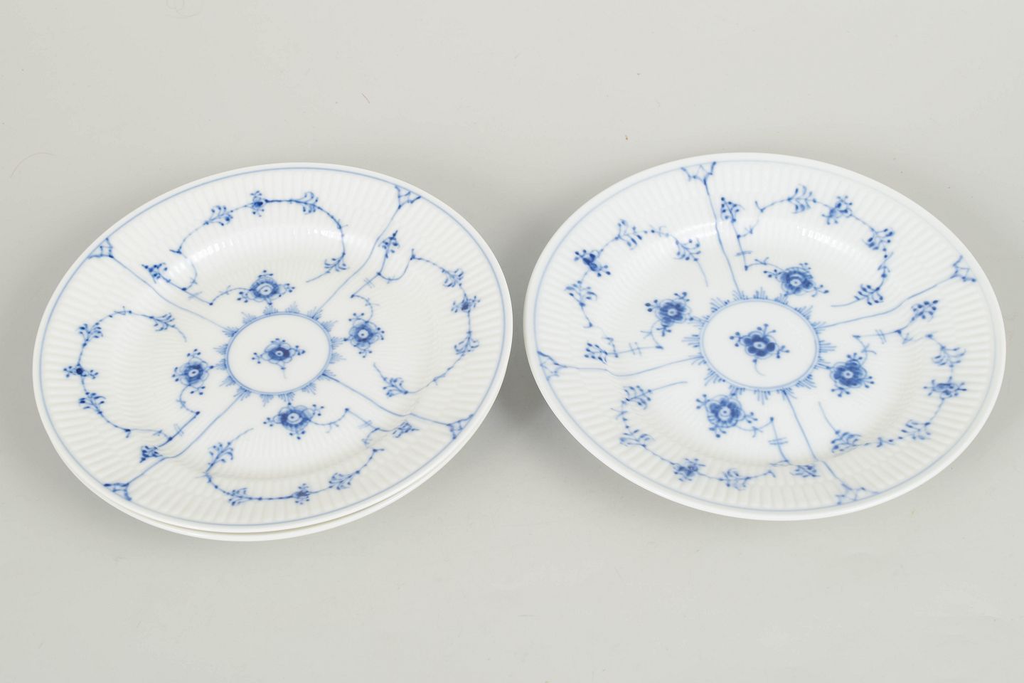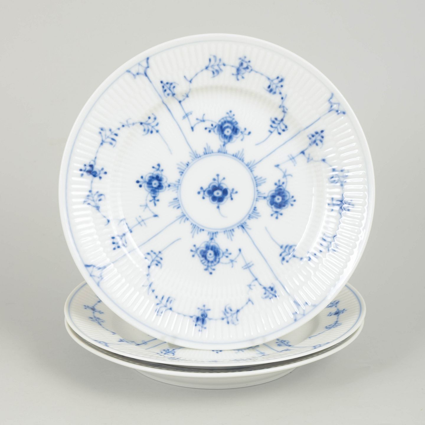 Set of three hand-painted porcelain plates decorated with the classic blue fluted pattern in cobalt underglaze. The plates feature a fluted rim and a central floral motif surrounded by stylised floral garlands, characteristic of the series. Marked underneath with the Royal Copenhagen factory mark and first factory quality. Model 1/179.