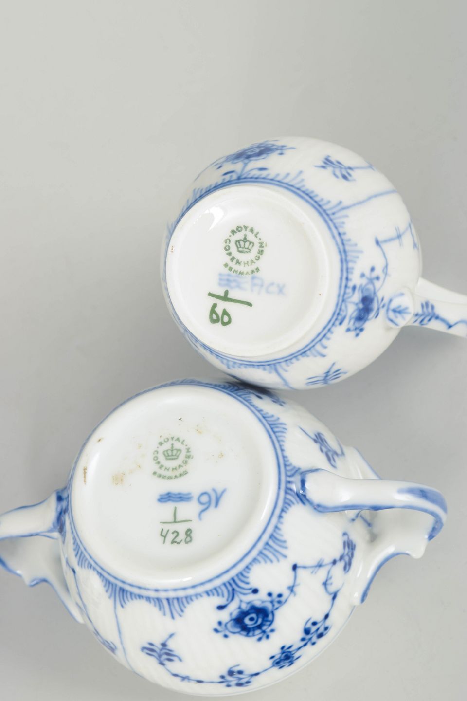 Håndmalet sukkerskål med låg og tilhørende flødekande i porcelæn dekoreret med det klassiske musselmalede riflet mønster i blå underglasur. Sukkerskålen har rund korpus med to svungne hanke og kuppelformet låg med knop, mens flødekanden har elegant svungen form med tud og hank. Begge dele er fabriksstemplet Royal Copenhagen, første sortering. Flødekande model 1/60 og sukkerskål model 1/428.