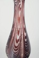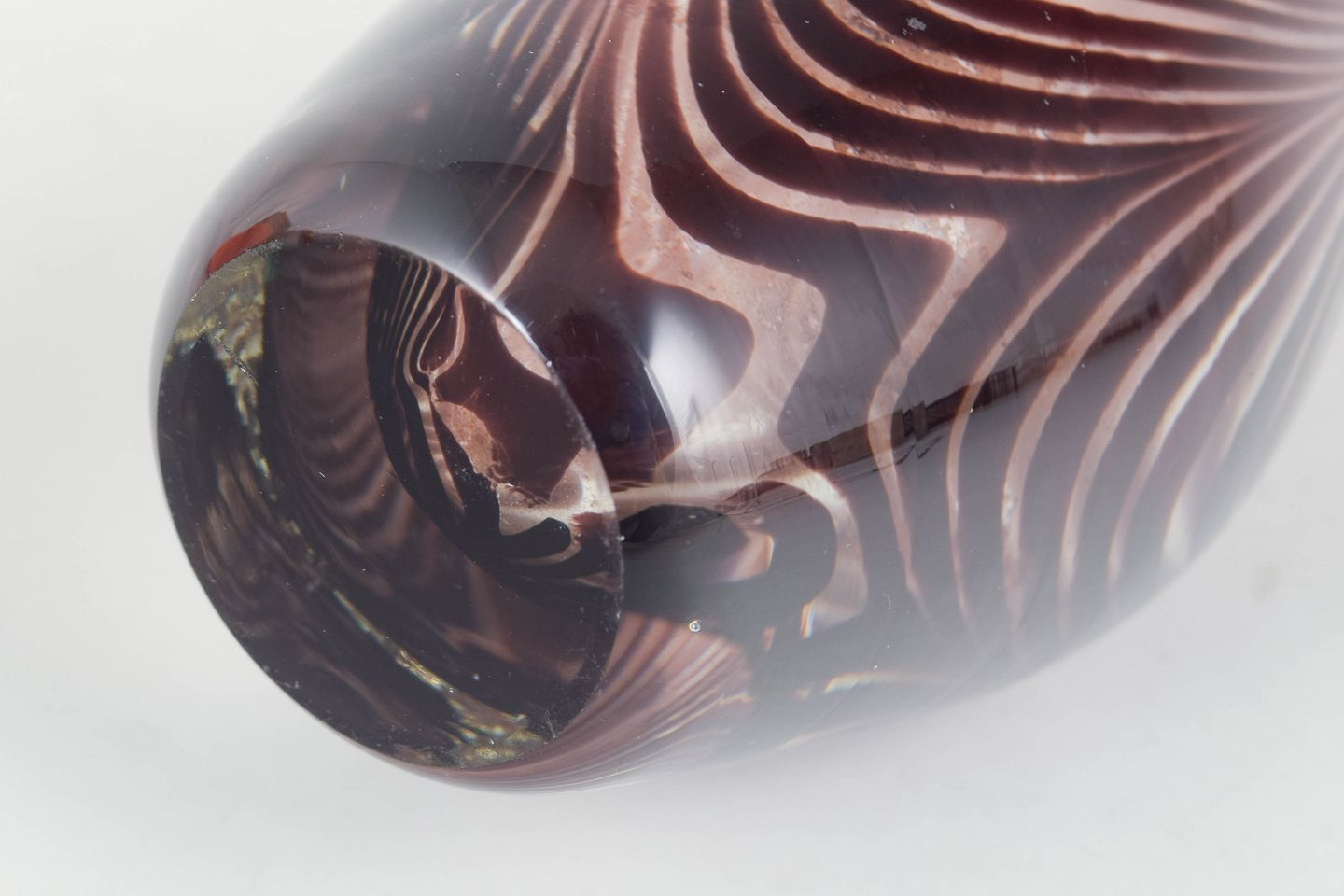 Dekorativ kunstglasvase i flerfarvet glas med spiralformede hvide tråde og bølgende åbning, udført i karakteristisk Murano-stil med skulpturel form.
