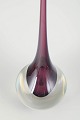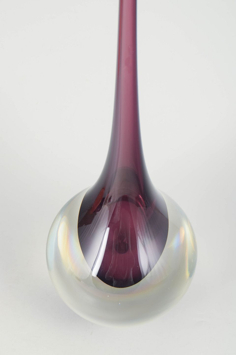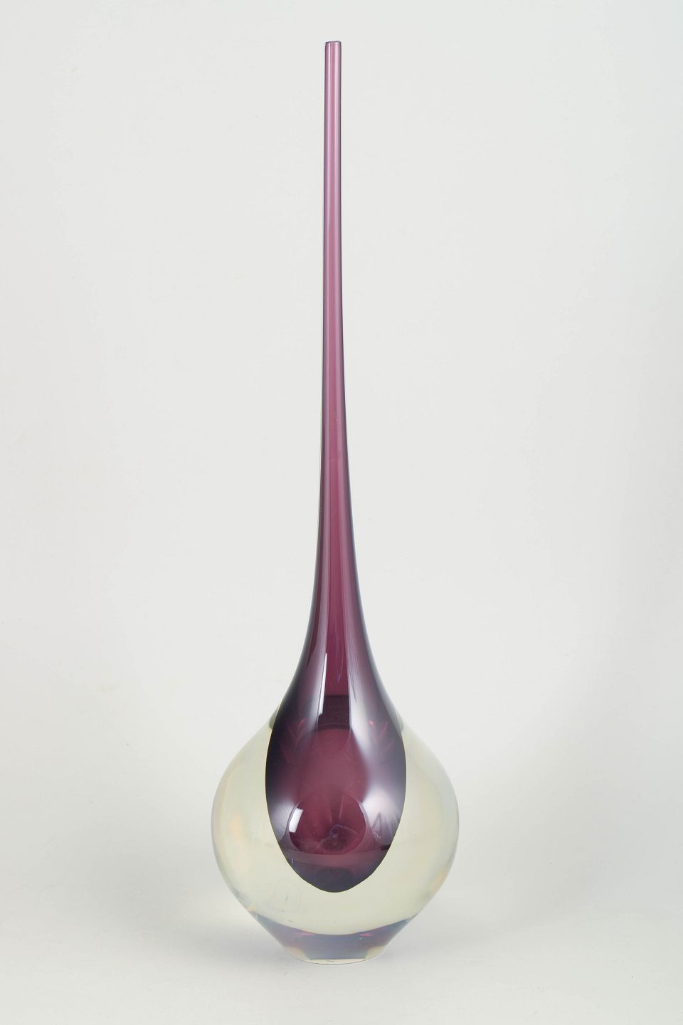 Elegant art glass vase in clear glass with an encased violet core and very long slender neck, produced in the characteristic Murano style with a sculptural teardrop form.