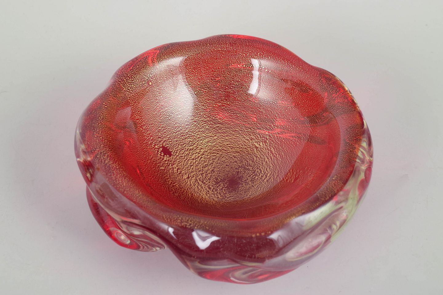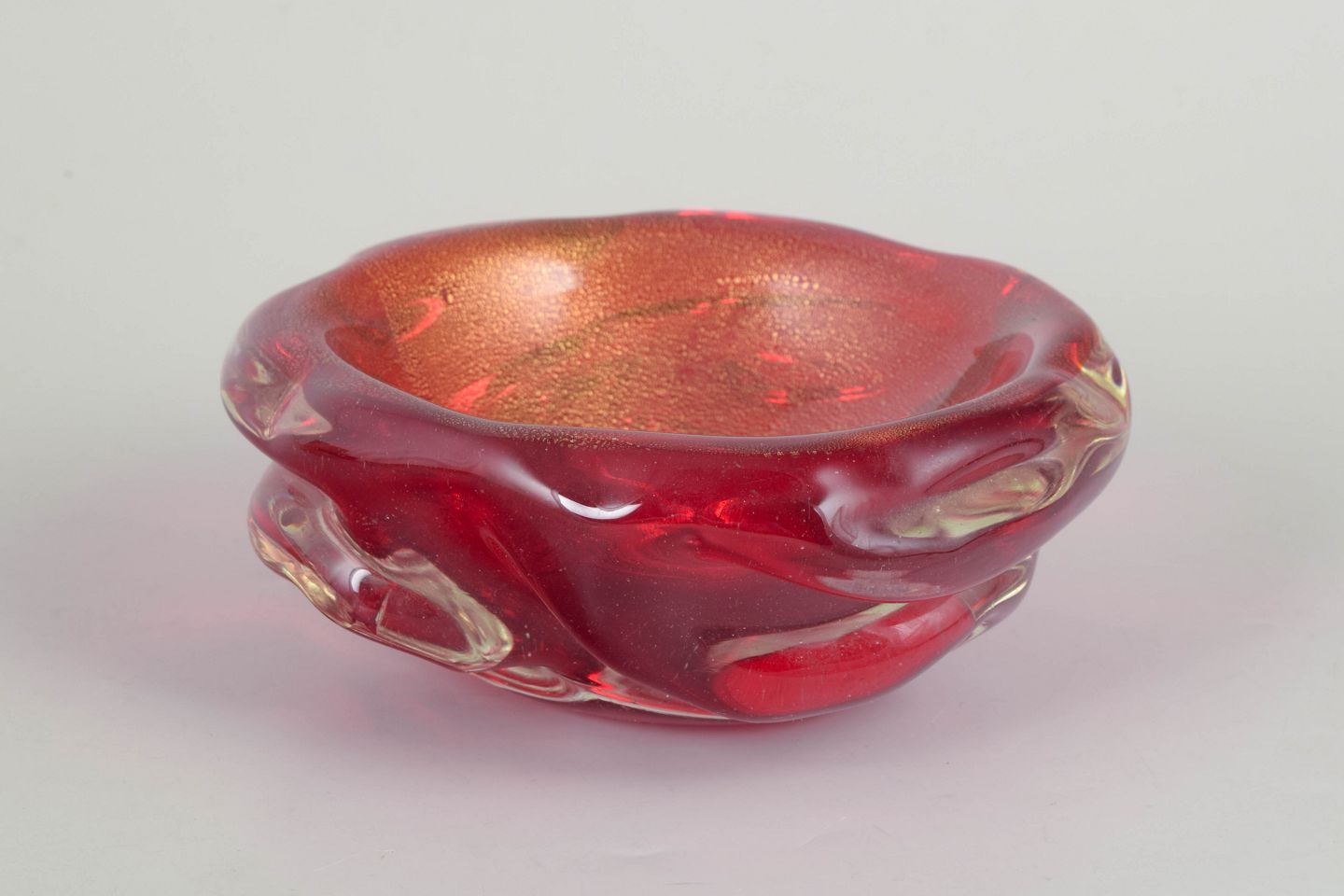 Heavy art glass bowl in red glass with iridescent surface and freely formed organic rim, characteristic of Murano’s sculptural mid-century glass production.