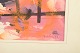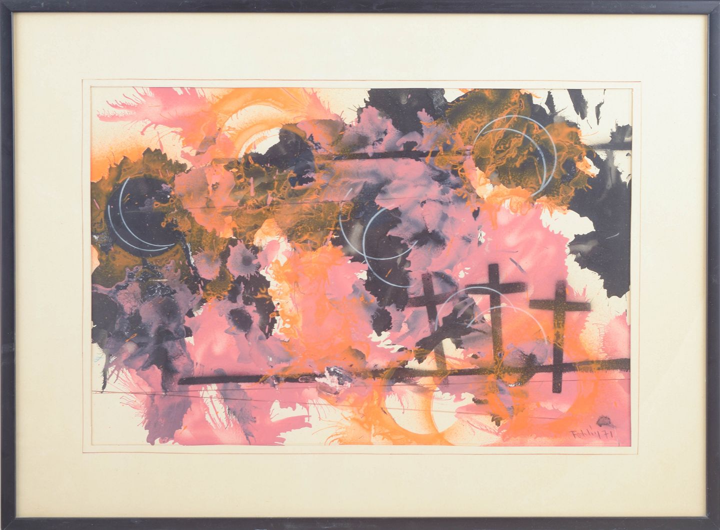 Abstrakt komposition udført i akvarel på papir med ekspressive farvefelter i rosa, orange, sorte og violette toner kombineret med grafiske linjer og cirkulære former. Kompositionen har en spontan og dynamisk opbygning med lagdelte strukturer og kontraster mellem transparente og mørkere farvefelter.