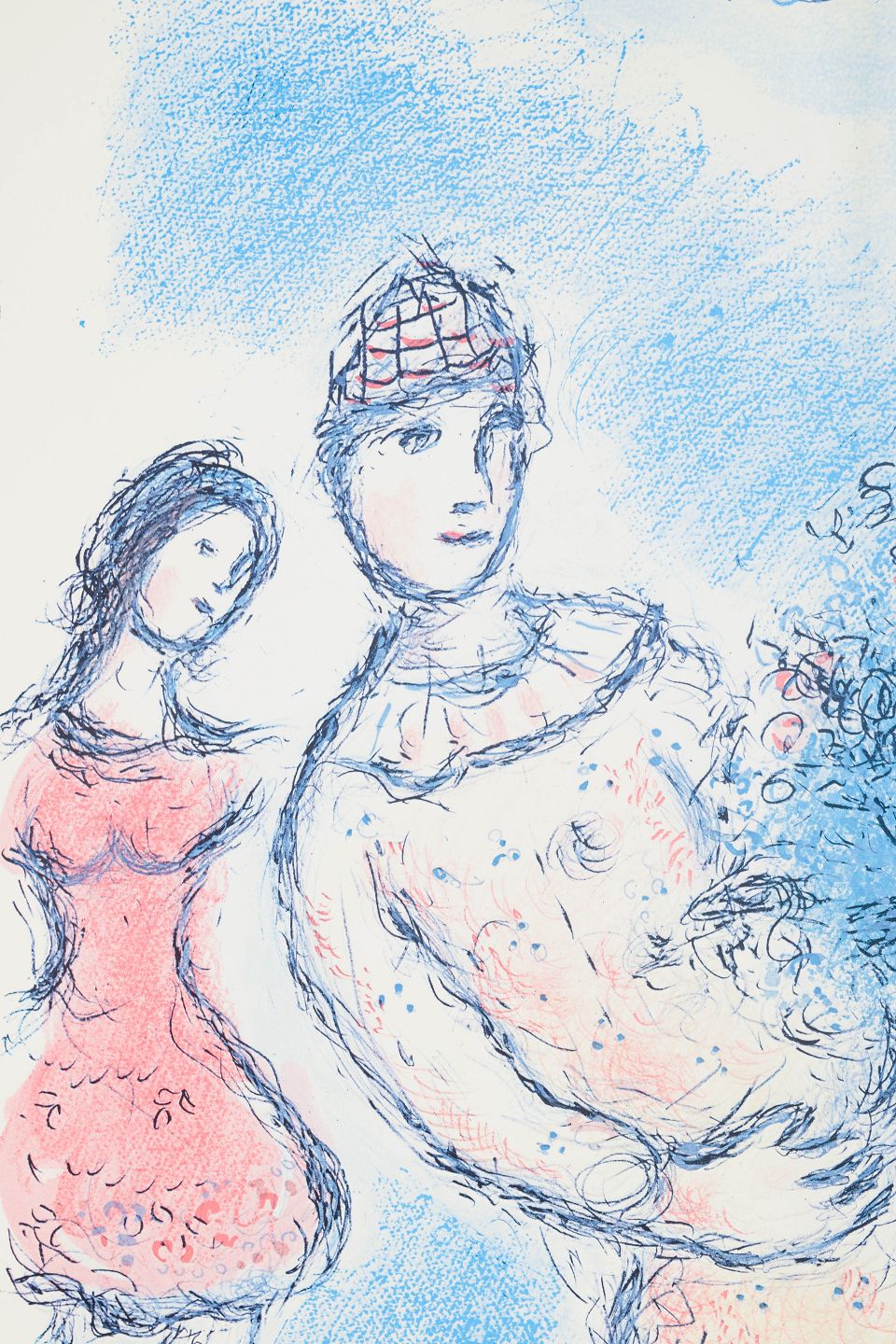 Marc Chagall (1887–1985) was a Russian-French artist and one of the most influential figures of twentieth-century modernism. He worked across painting, printmaking, stage design and stained glass, and is known for poetic compositions featuring floating figures, lovers, animals and cityscapes. Chagall developed a highly personal visual language combining elements of cubism, fauvism and symbolism. His lithographs and graphic works, often produced in collaboration with Parisian ateliers such as Mourlot, are among the most celebrated graphic works of the twentieth century.