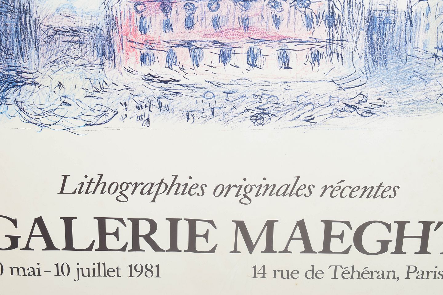 Poster published in connection with the exhibition “Lithographies originales récentes” at Galerie Maeght, Paris, 20 May – 10 July 1981. The motif shows a characteristic poetic and dreamlike scene with floating figures and architectural elements, rendered in Chagall’s recognisable style with soft colours and lyrical linework.