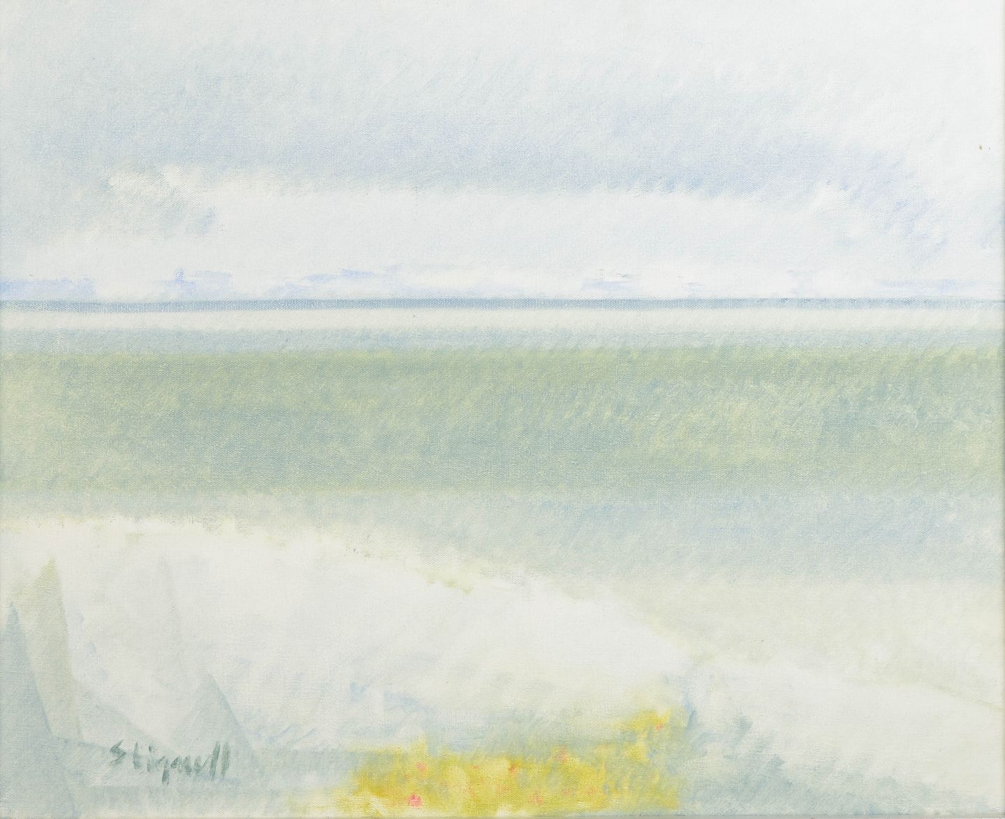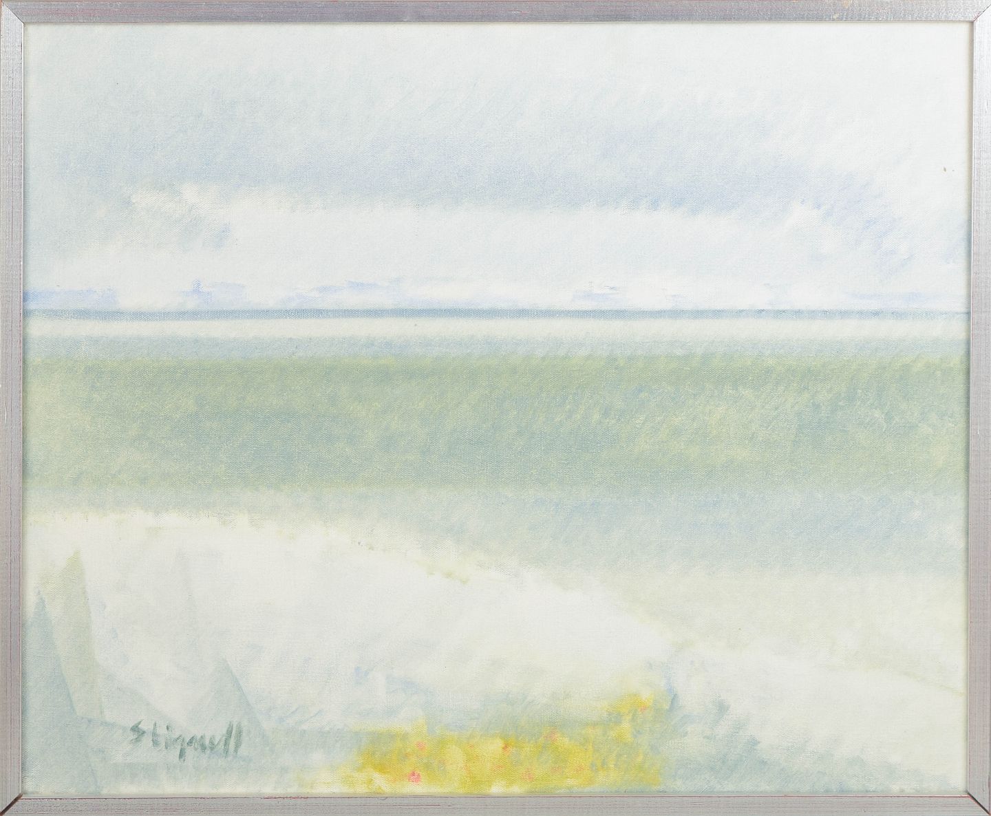 Landscape composition executed in soft muted tones depicting a stylised coastal scene with sea and distant horizon. The composition is structured with broad areas of colour and gentle transitions, creating a calm atmospheric impression characteristic of Nordic modernist landscape painting of the mid-twentieth century.