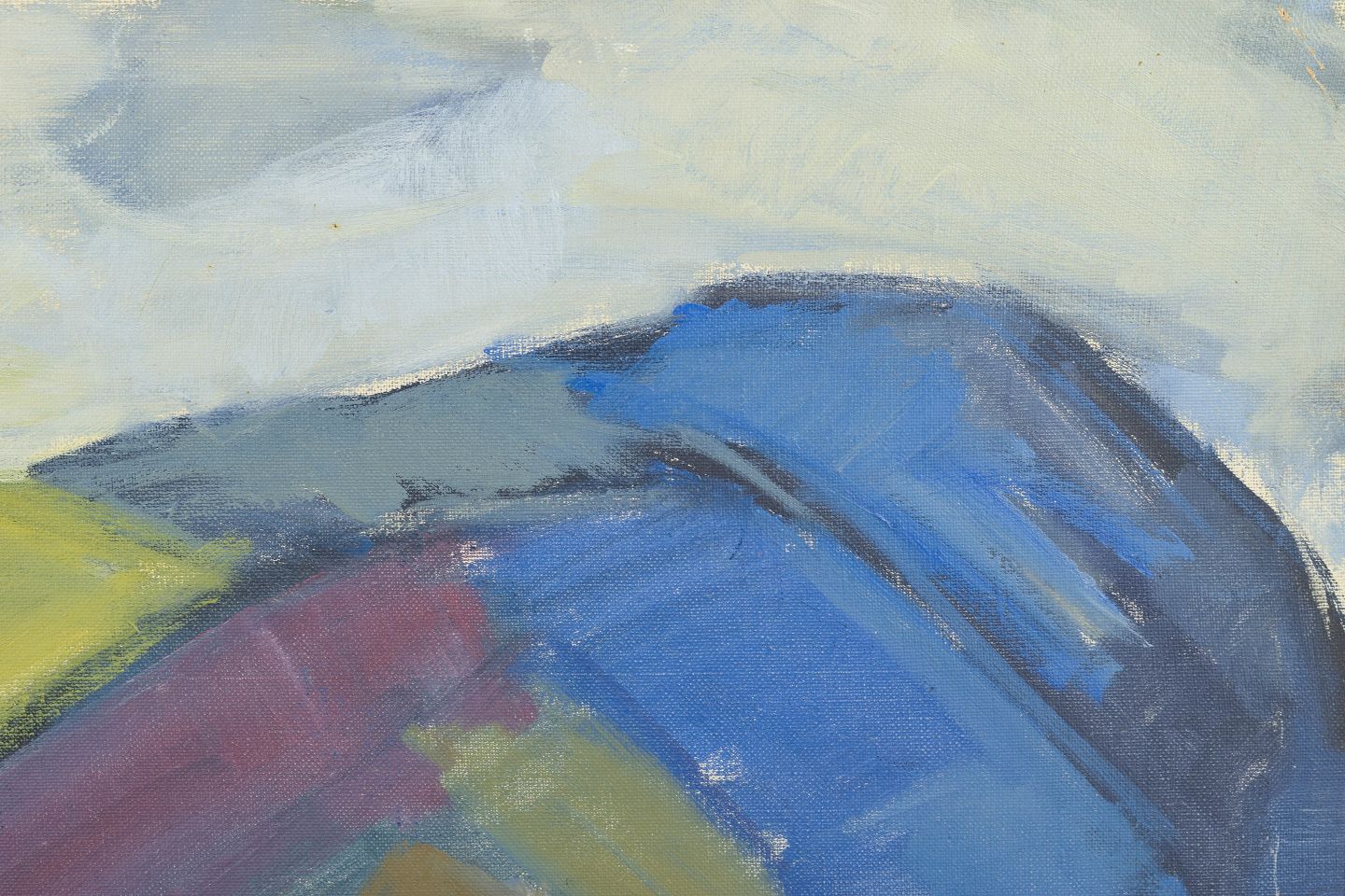 Modernistisk nordisk landskab med stiliserede former og spejling i vandflade, udført i brede penselstrøg og afdæmpede farver i blå, grønne og violette toner. Signeret.