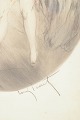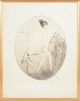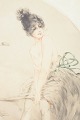 Elegant figurativ komposition udført som farve-etsning med en ung kvinde og en kakadue i et dekorativt og teatralsk motiv.