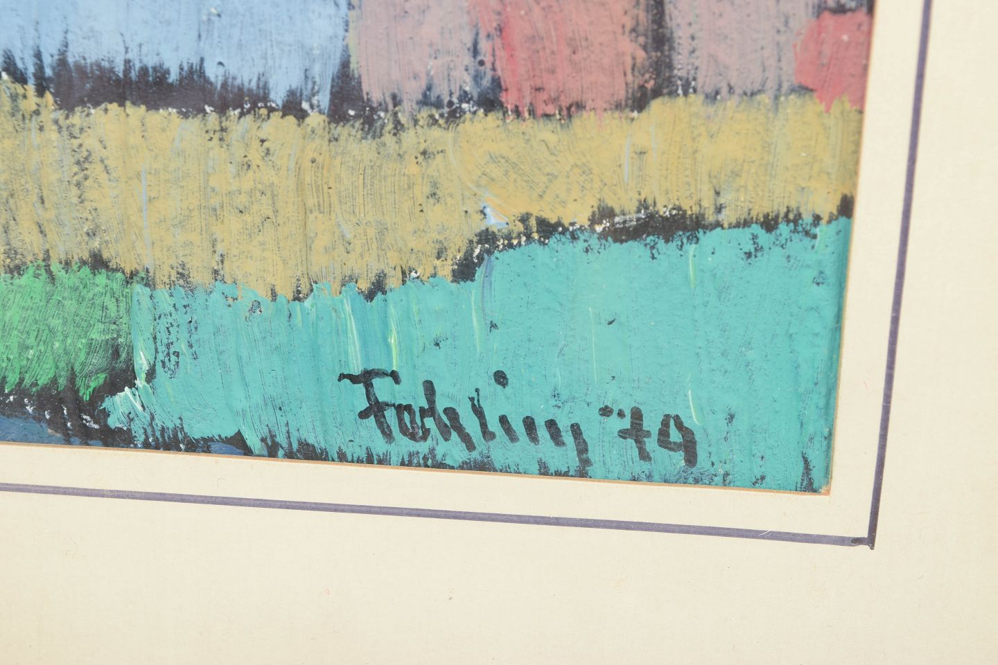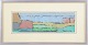 Abstrakt landskabskomposition udført i olie på papir med stiliserede former, der antyder huse og marker i et åbent landskab. Motivet er opbygget i horisontale farvefelter i blå, grønne, gule og rosa toner med en mørkere konturlinje langs horisonten.