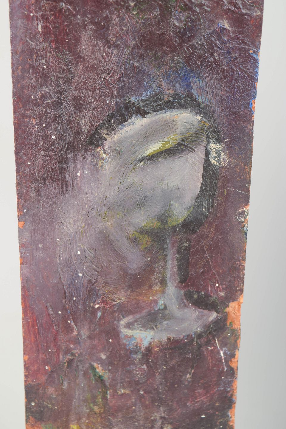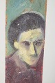 Narrow vertical figurative composition executed in oil on a wooden panel. The painting depicts a stylised human figure rendered in muted green, red, and grey tones, giving the work a dreamlike and slightly expressionistic character. The elongated format creates an almost icon-like appearance, with the figure placed centrally within a simple painted background.