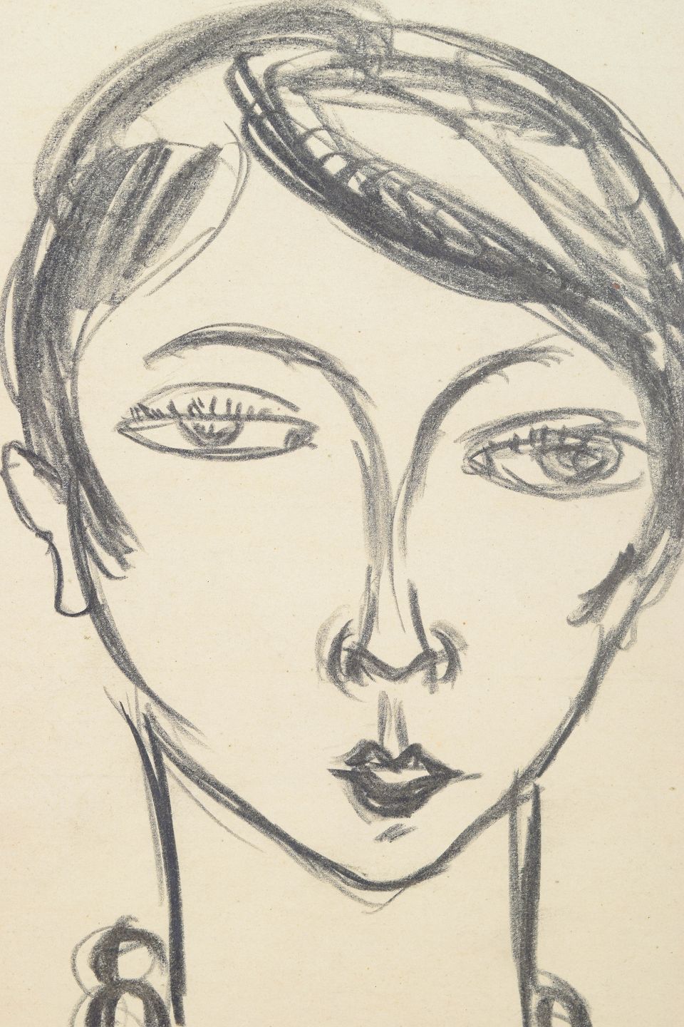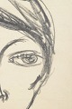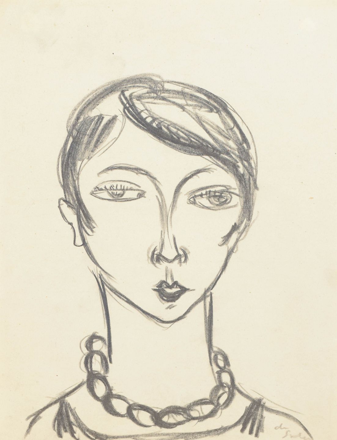 Art deco portrait drawing executed on paper with elegant and economical line work. The composition depicts a stylised female portrait with short hair and a necklace, rendered in a simplified graphic style characteristic of modernist drawing from the 1930s. Signed in pencil lower right.