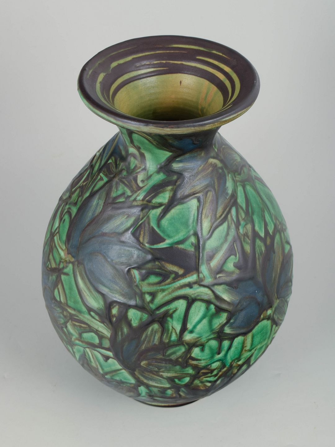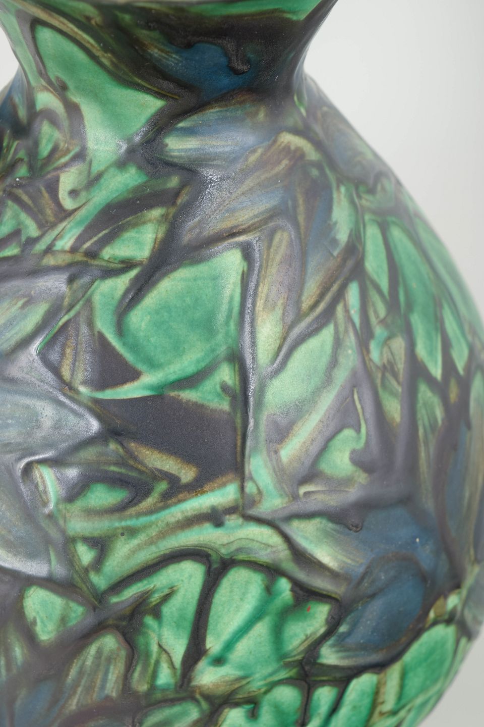 Large vase in glazed earthenware with a baluster form and narrow neck. Executed in the characteristic cowhorn glaze with deep green, blue and dark tones, where the glaze flows in organic patterns creating a dramatic and vivid surface. Signed HAK to the base.