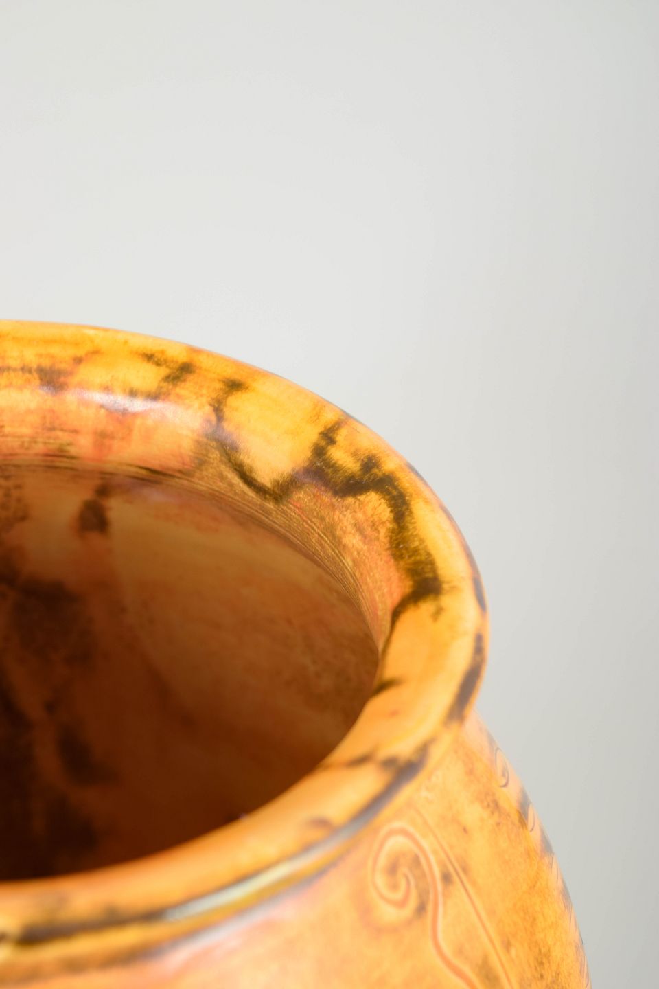Large baluster-shaped vase in glazed earthenware with vertically arranged relief panels and undulating ornamentation. Executed in a light yellow glaze with warm orange tones and lively surface variation. Signed HAK to the base.