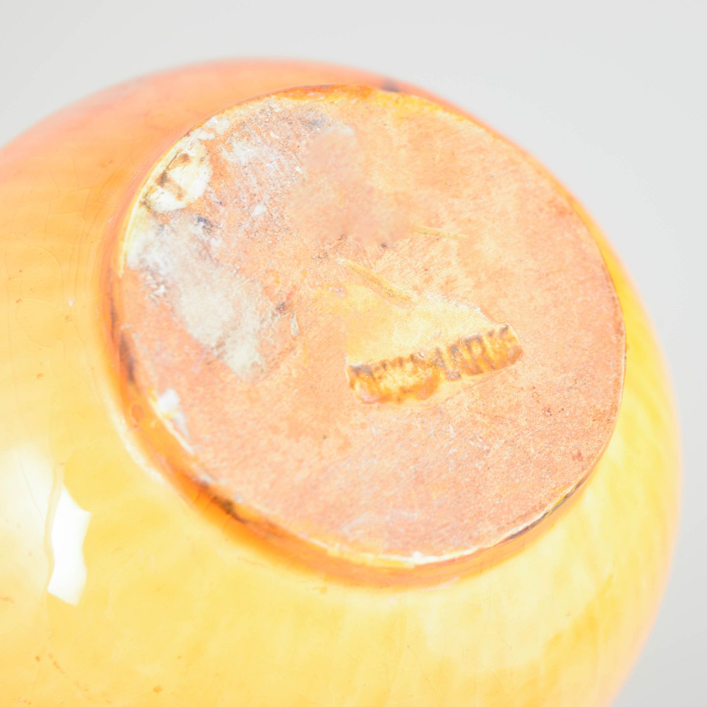 Elegant vase i glaseret lertøj med blød balusterform og let udsvungen rand. Udført i lys gul glasur med varme orange toner og fin vertikal stribning i overfladen, typisk for Hammershøis arbejde med levende glasurer.