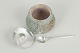 Hand-thrown stoneware jar with a rounded, slightly bulbous form and a multicoloured glaze in blue, green and brown tones. Fitted with a sterling silver lid and spoon by Hans Hansen, in an elegant Art Deco design from 1939.