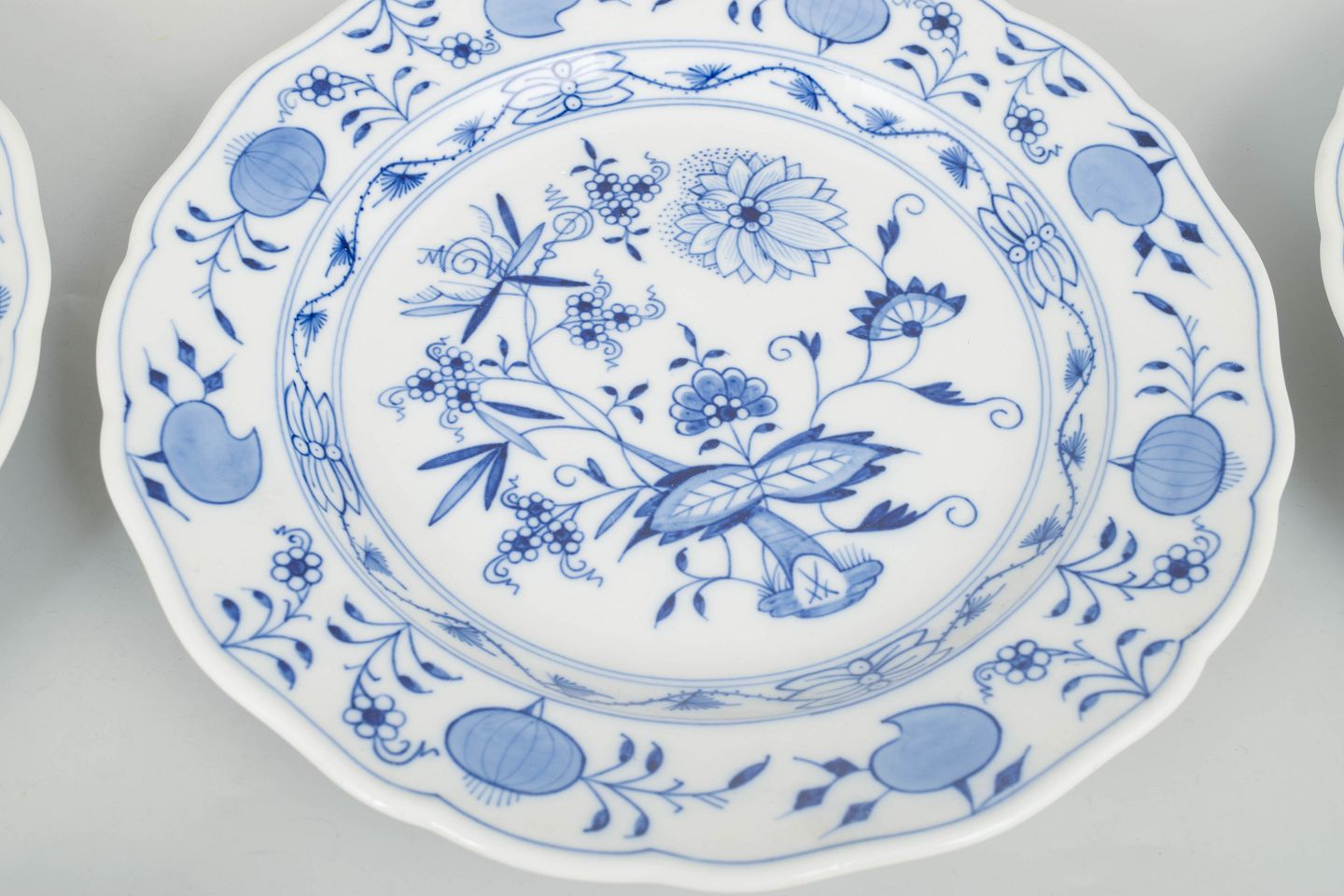 Three porcelain dinner plates with hand-painted blue decoration in the classic Blue Onion pattern. First factory quality, marked with Meissen crossed swords. Diameter 24 cm.