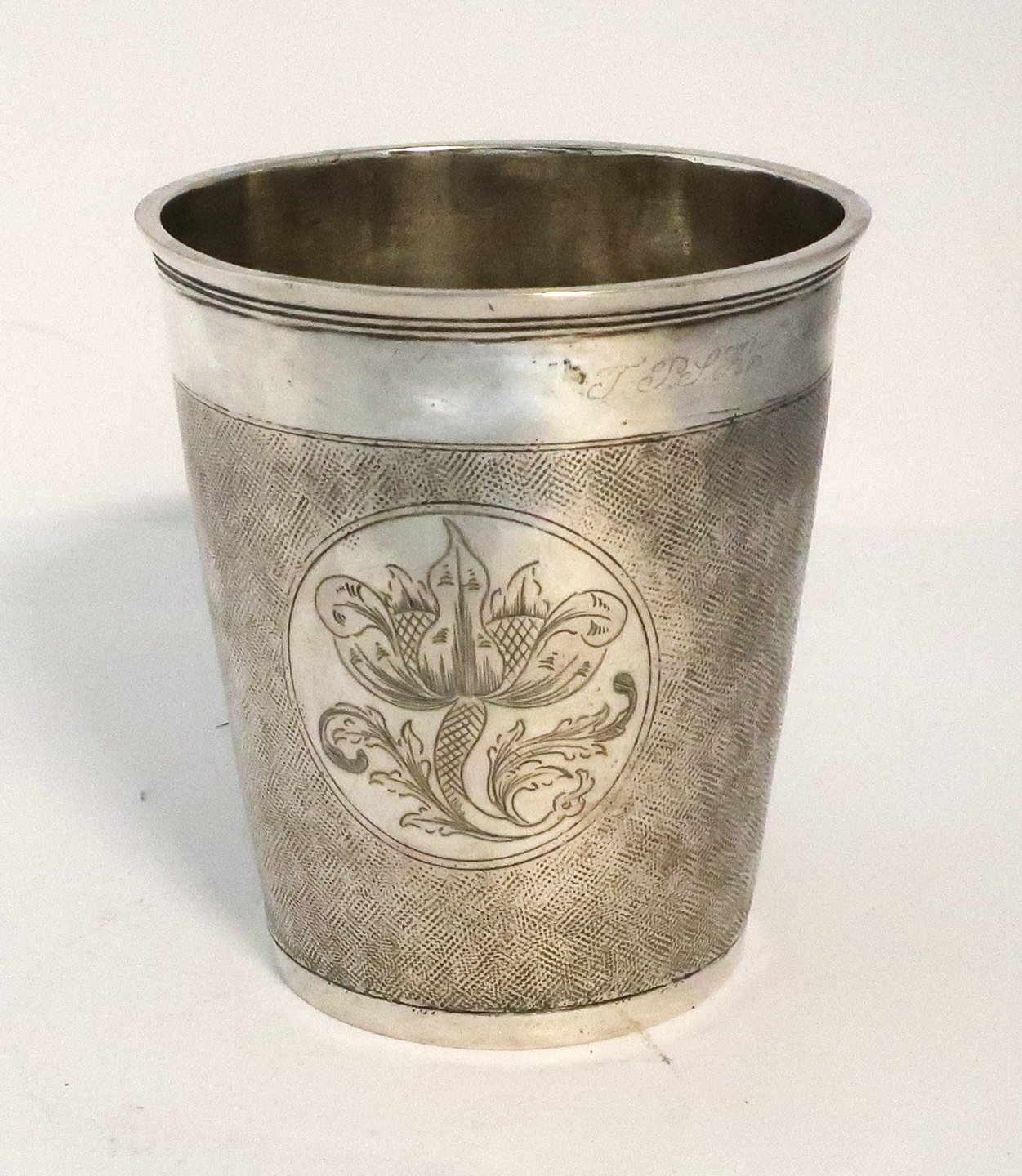 Christian Frederik Nyested, Horsens. Sølv bæger nålepunslet. Højde 9,6 cm. Diameter 8,7 cm