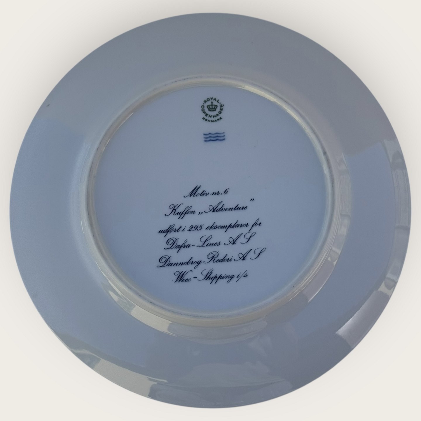 Royal Copenhagen, Motif 6, Kuffen "Adventure", Made in 295 copies for Dafra-Lines A/S, Dannebrog Rederi A/S, Weco-Shipping I/S, 25cm in diameter, perfect condition