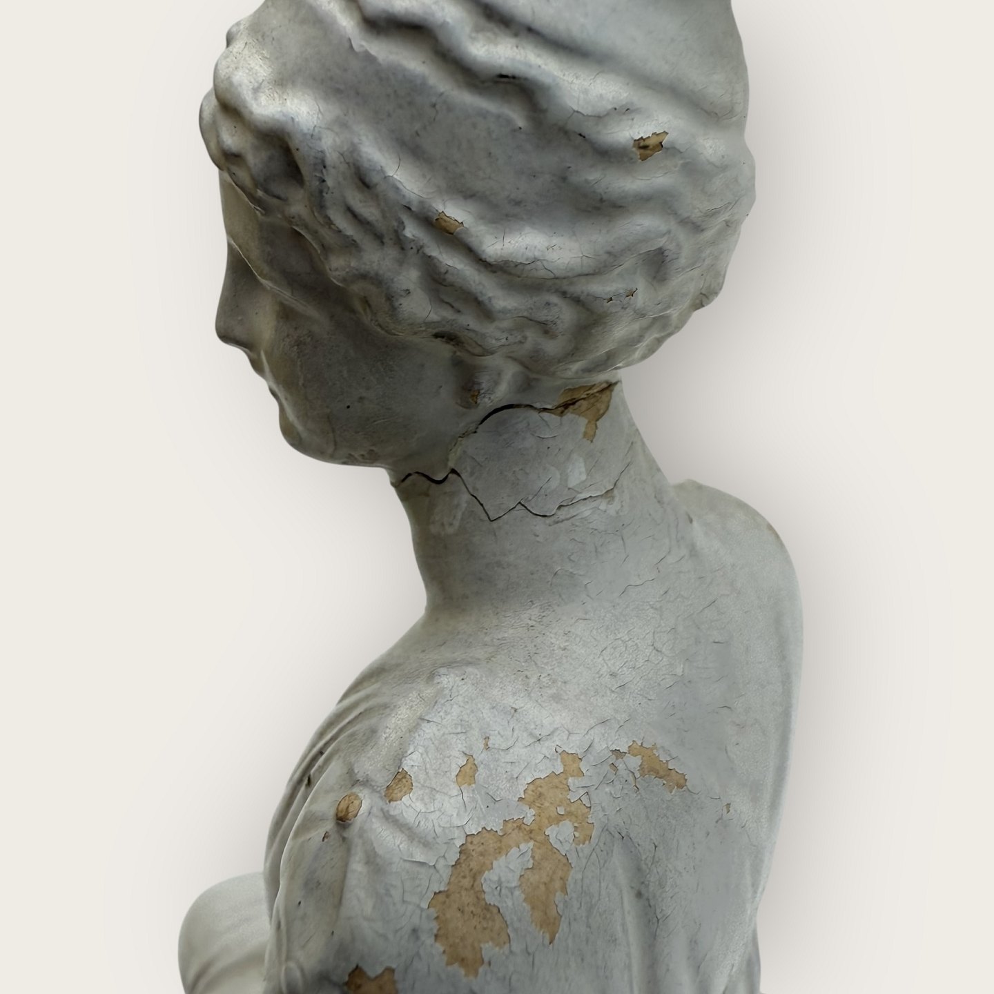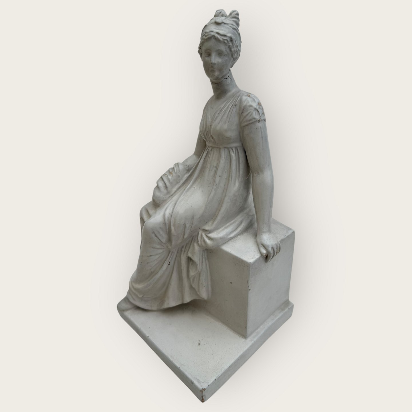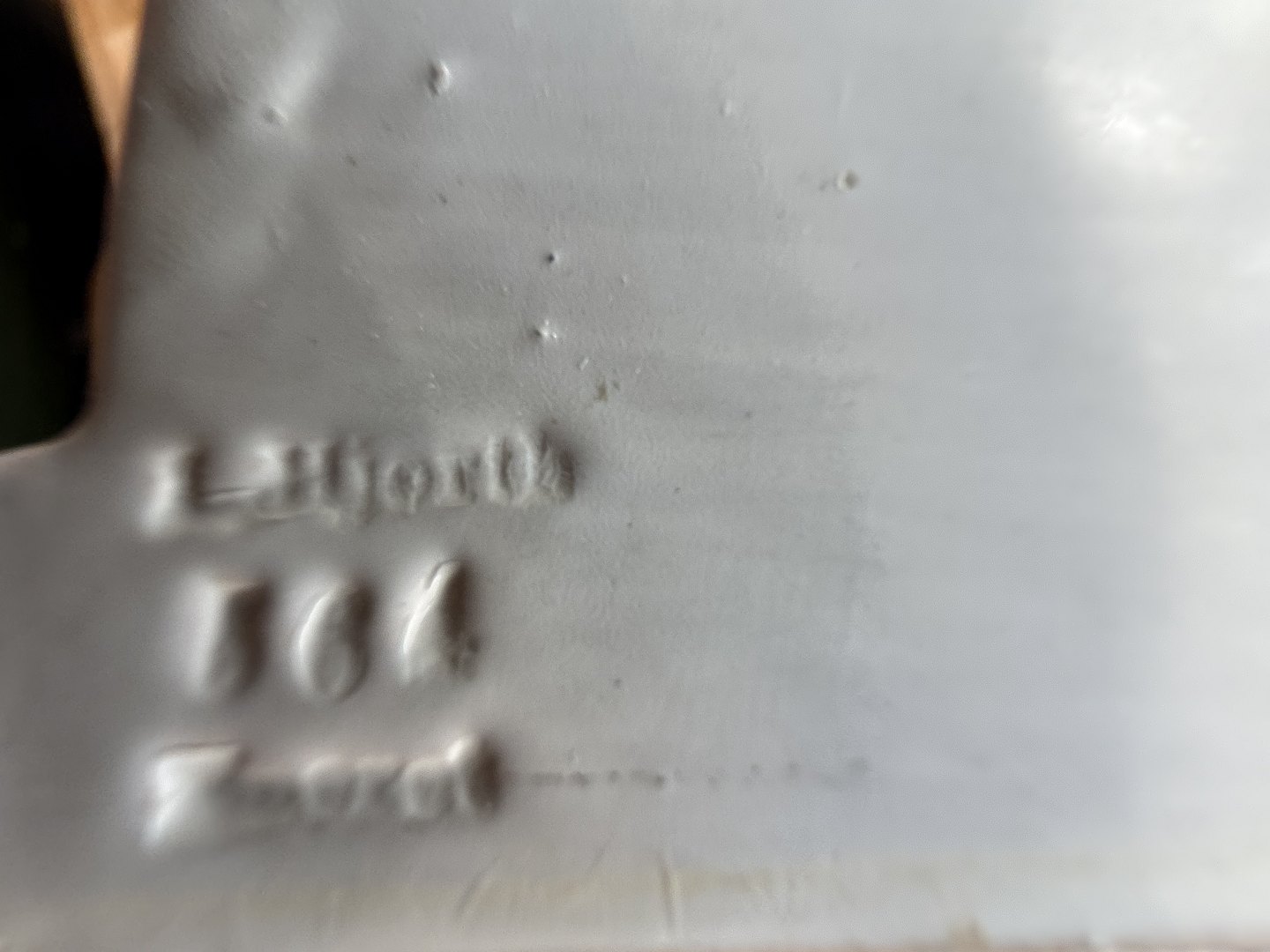Older female figurine from Hjorth ceramics, Stamped: Hjort, 564, Exclusive, Measures approx. 23.5x12x11 cm, Has repair on the neck (see photo) and light peeling / patinated.