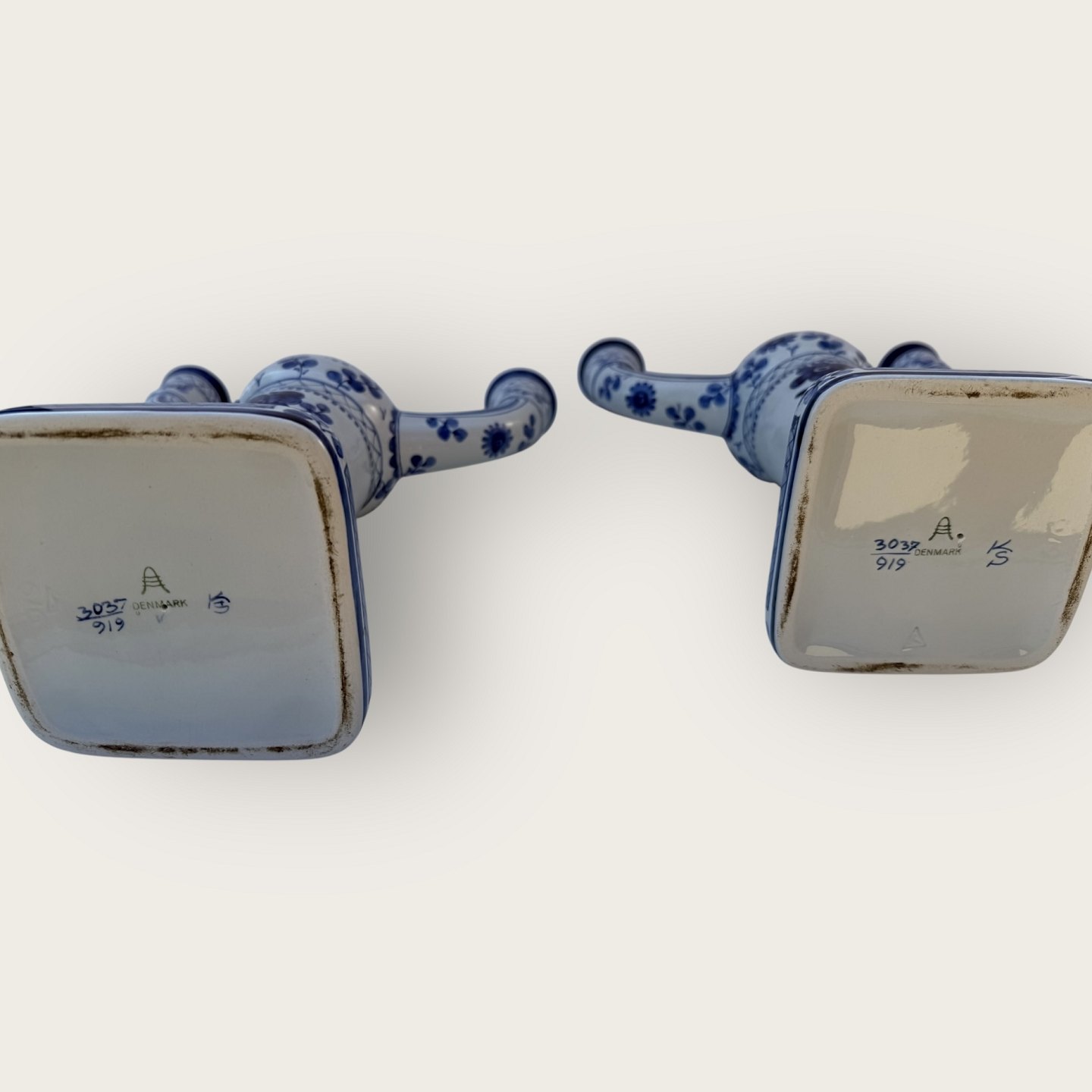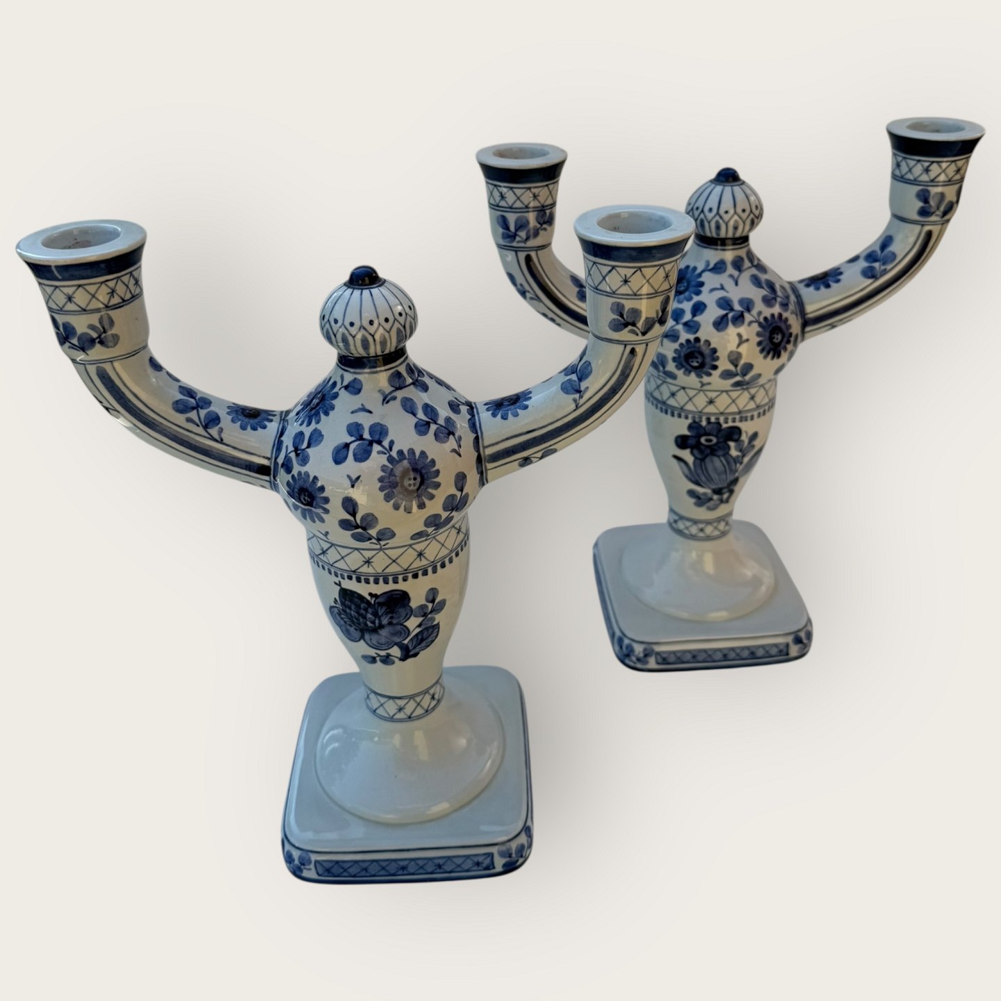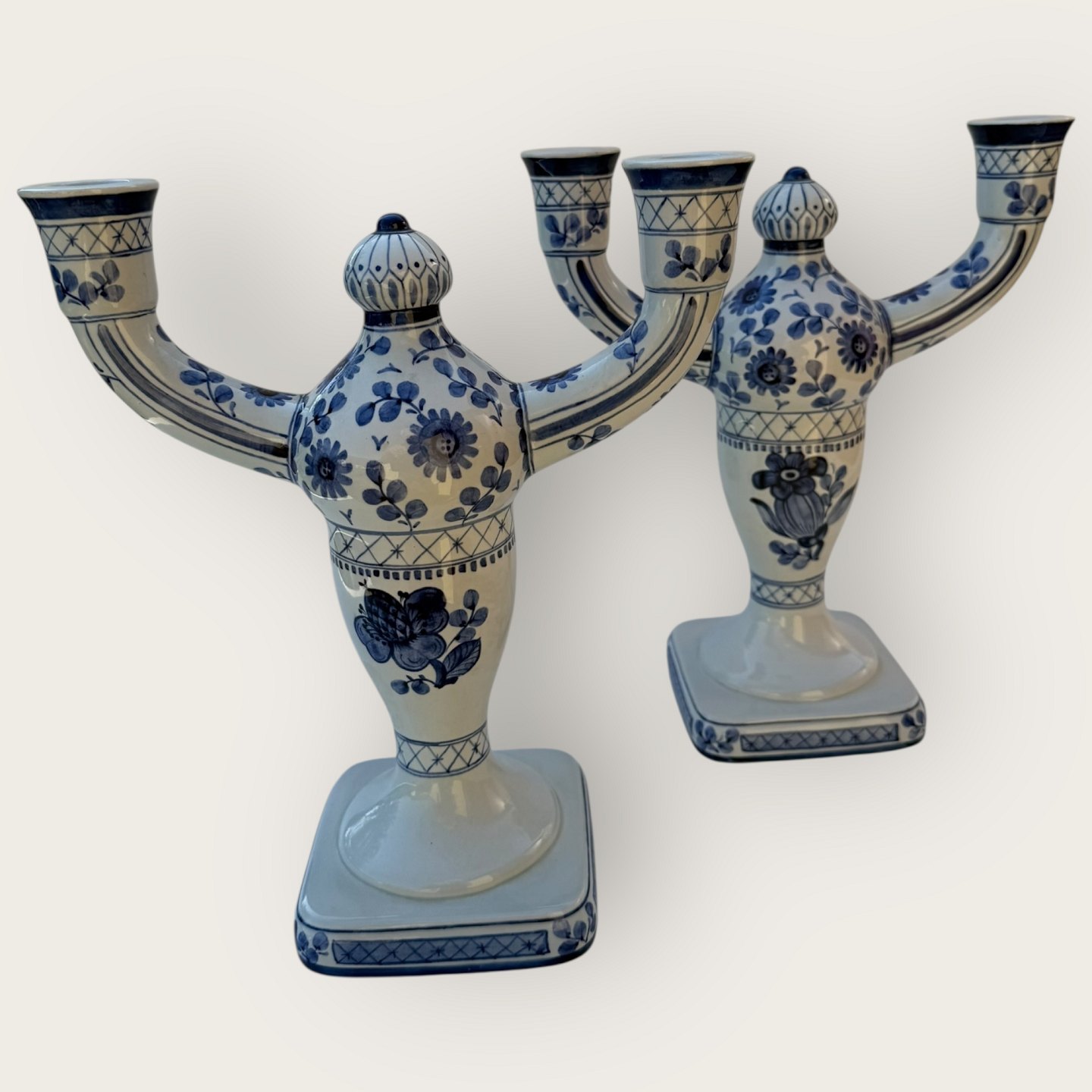Royal Copenhagen, Aluminia, Tranquebar A set of 2-armed candlesticks, #3037/919, a few small cracks under the glaze, otherwise very good condition, 1st grade, design Christian Joachim, Dimensions for one candlestick: Height 25.5cm, width 22cm, sold together.