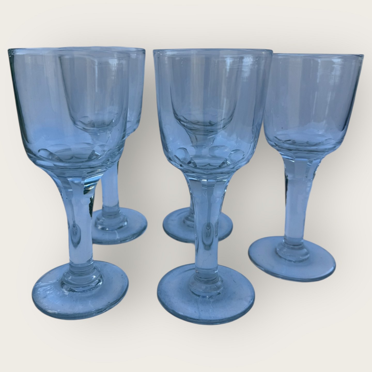 Tall older glasses with a cut stem, wide bowl and thick glass, height 21.3cm, diameter 9cm