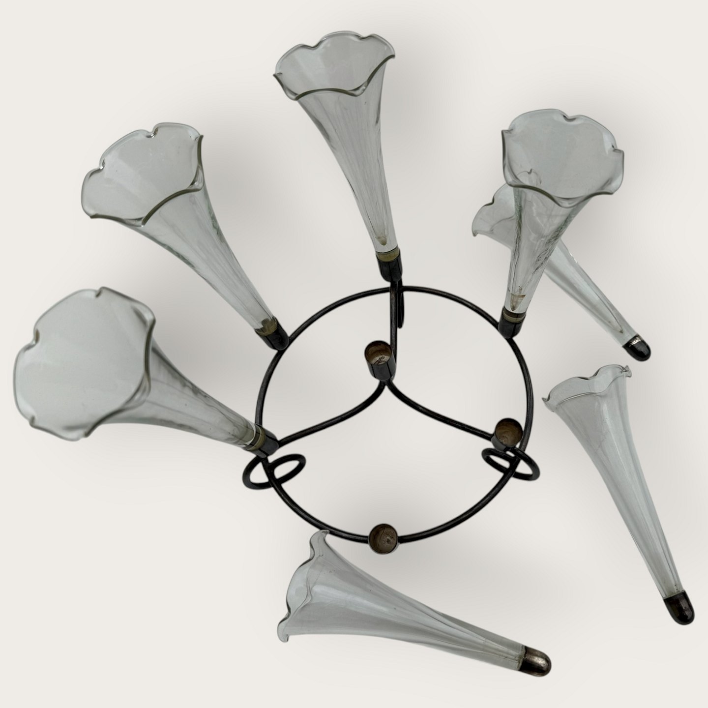 Epergne-Vase, Feines dünnes Glas mit gerüschtem Rand, alle Vasen mit versilberter Montierung, 7 Vasen in Jugendstil-Halterung, ca. 19cm hoch und 24cm im Durchmesser, jede Glasvase 13x5cm *Guter Zustand*
