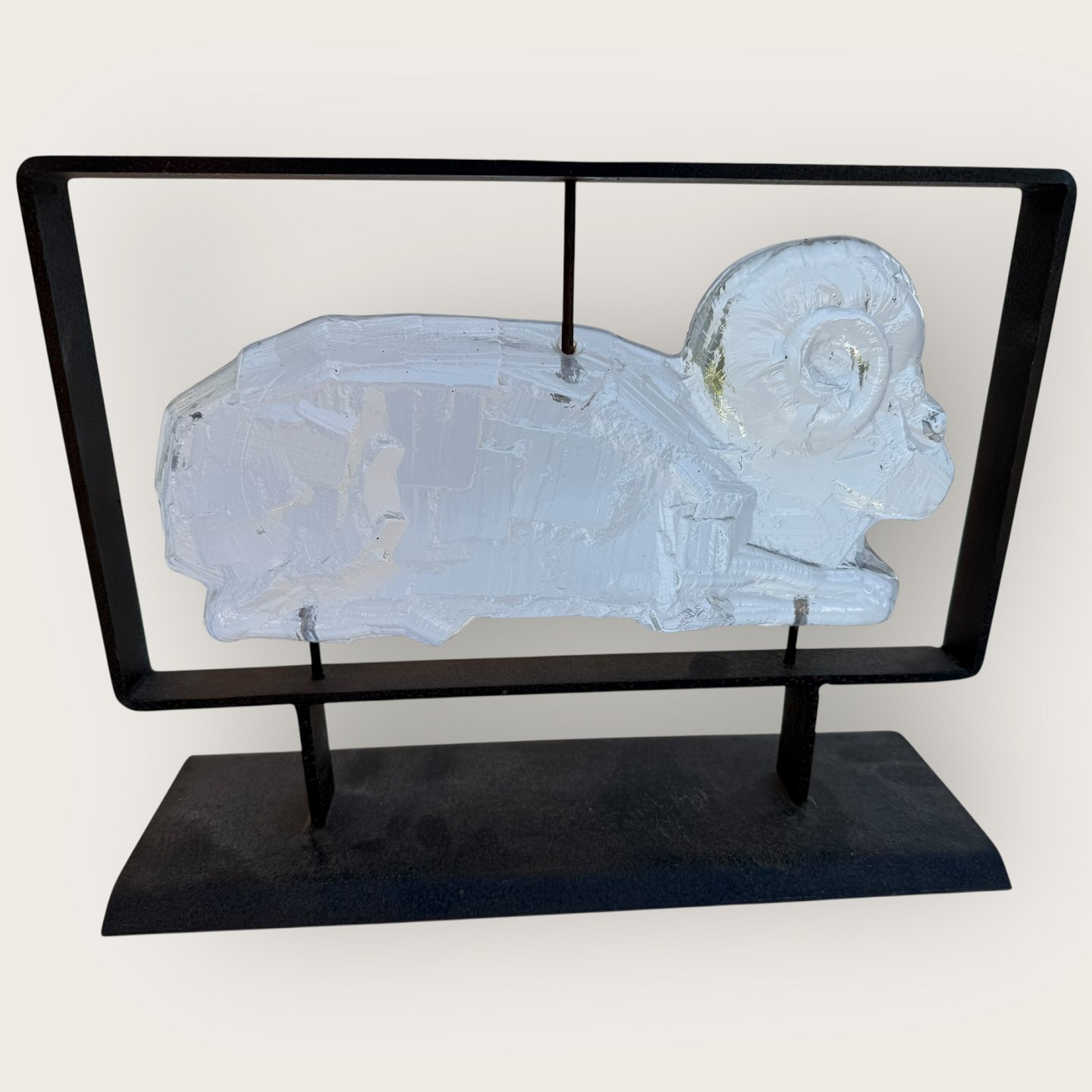 Kosta Boda, Erik Höglund, glasfigur af vædder monteret i metalramme; Mål: 25x33x11cm, * Lidt mærker i glasset omkring metalmonteringen (se foto) ellers rigtig fin stand*