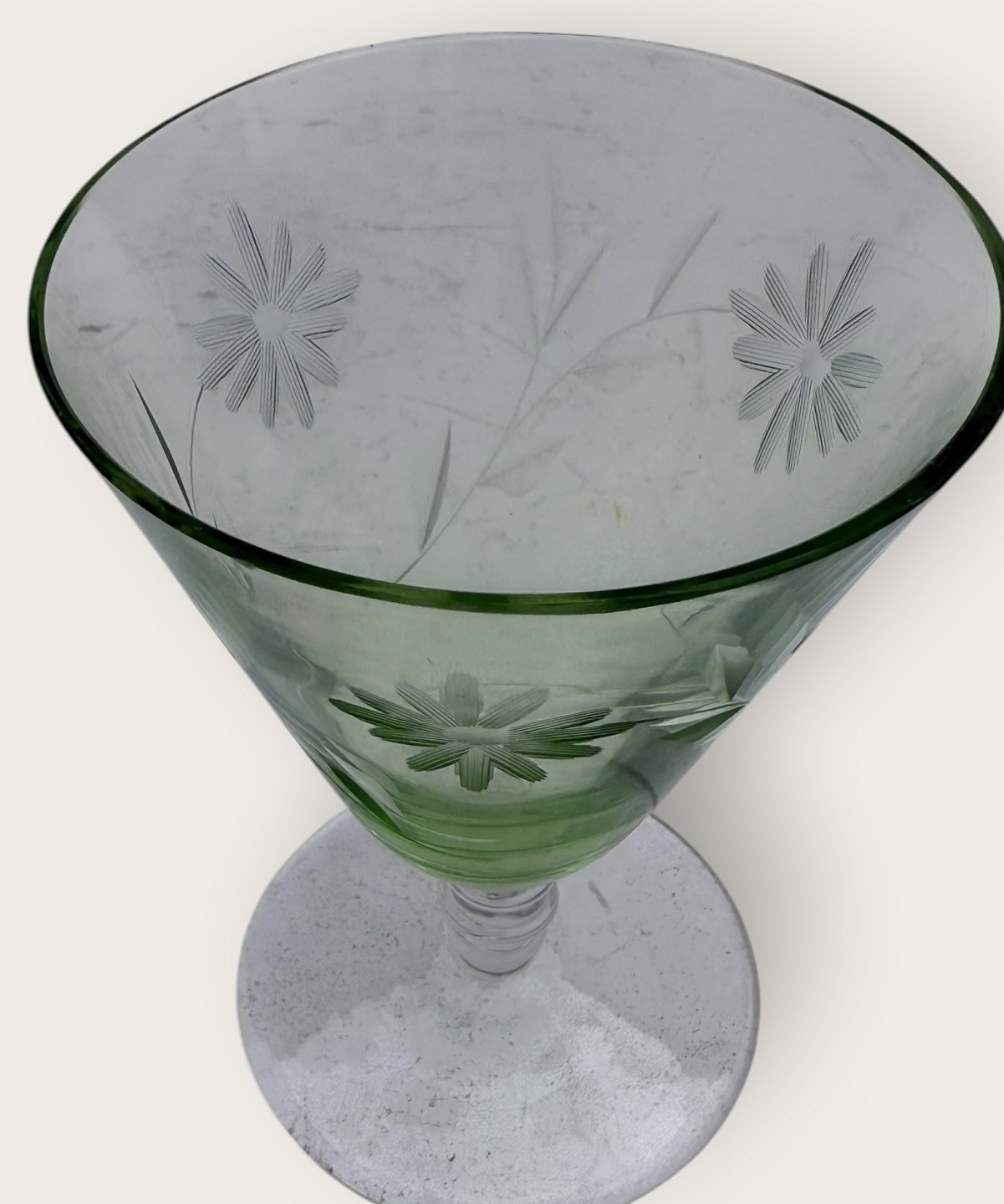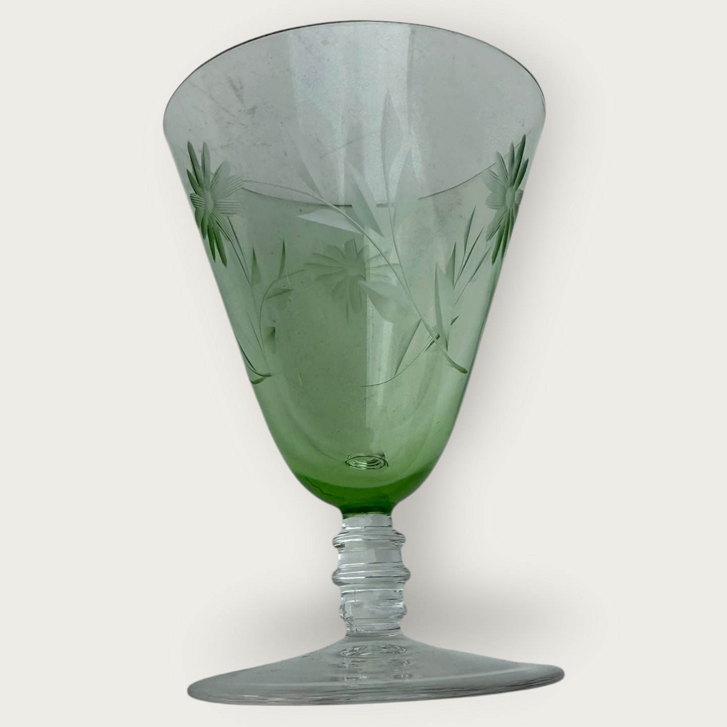 Grønne hvidvinsglas med blomsterslibninger, Højde 10,5cm, diameter 7,5cm *pæn stand*