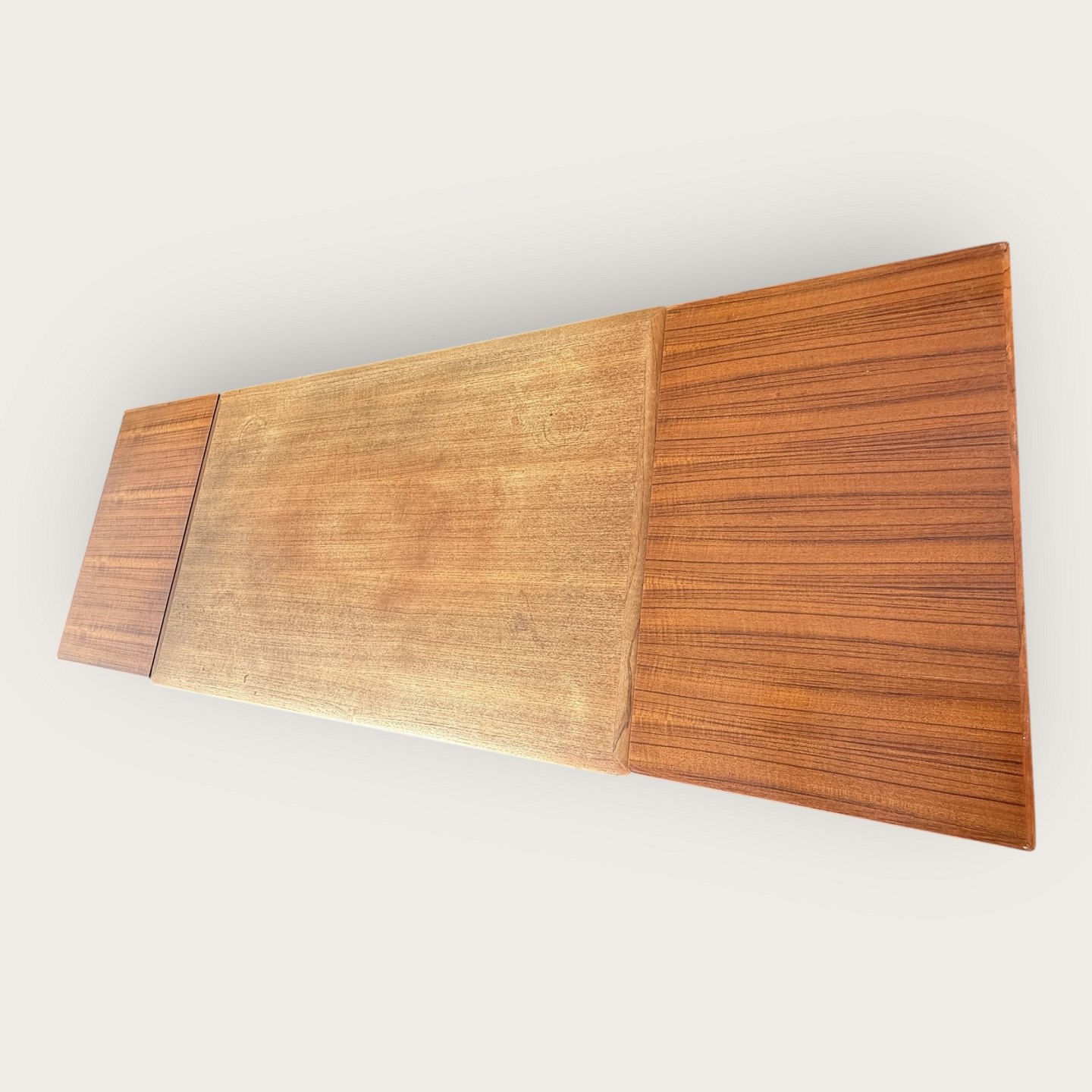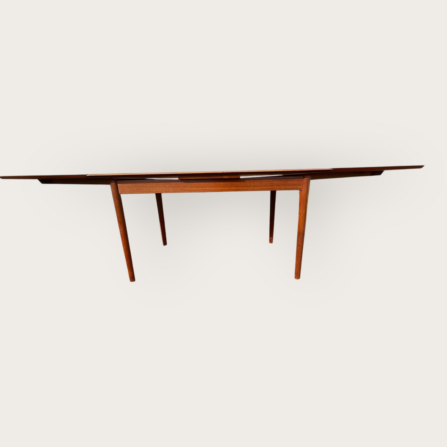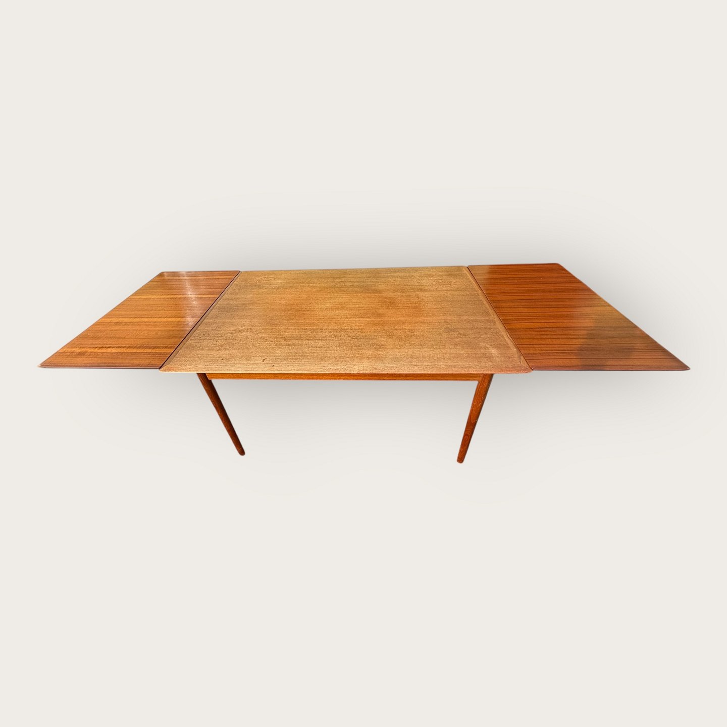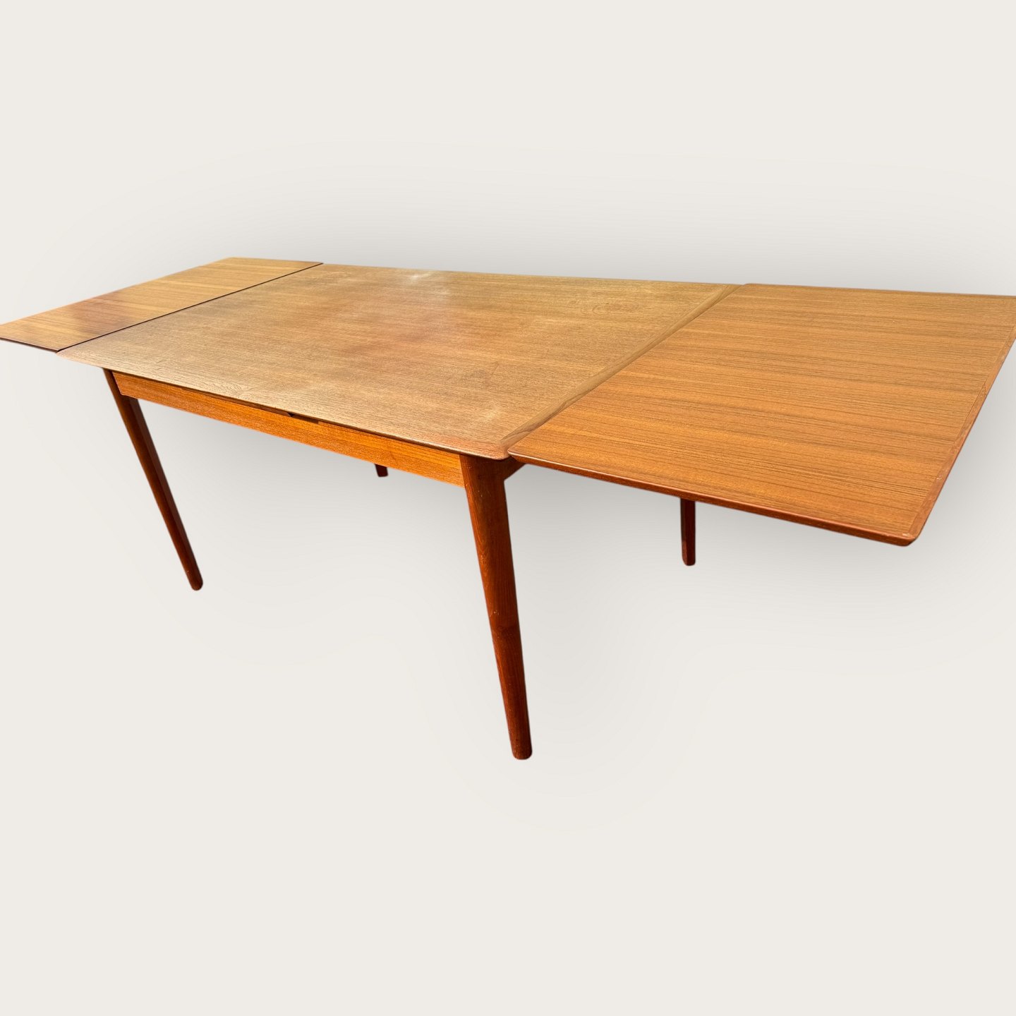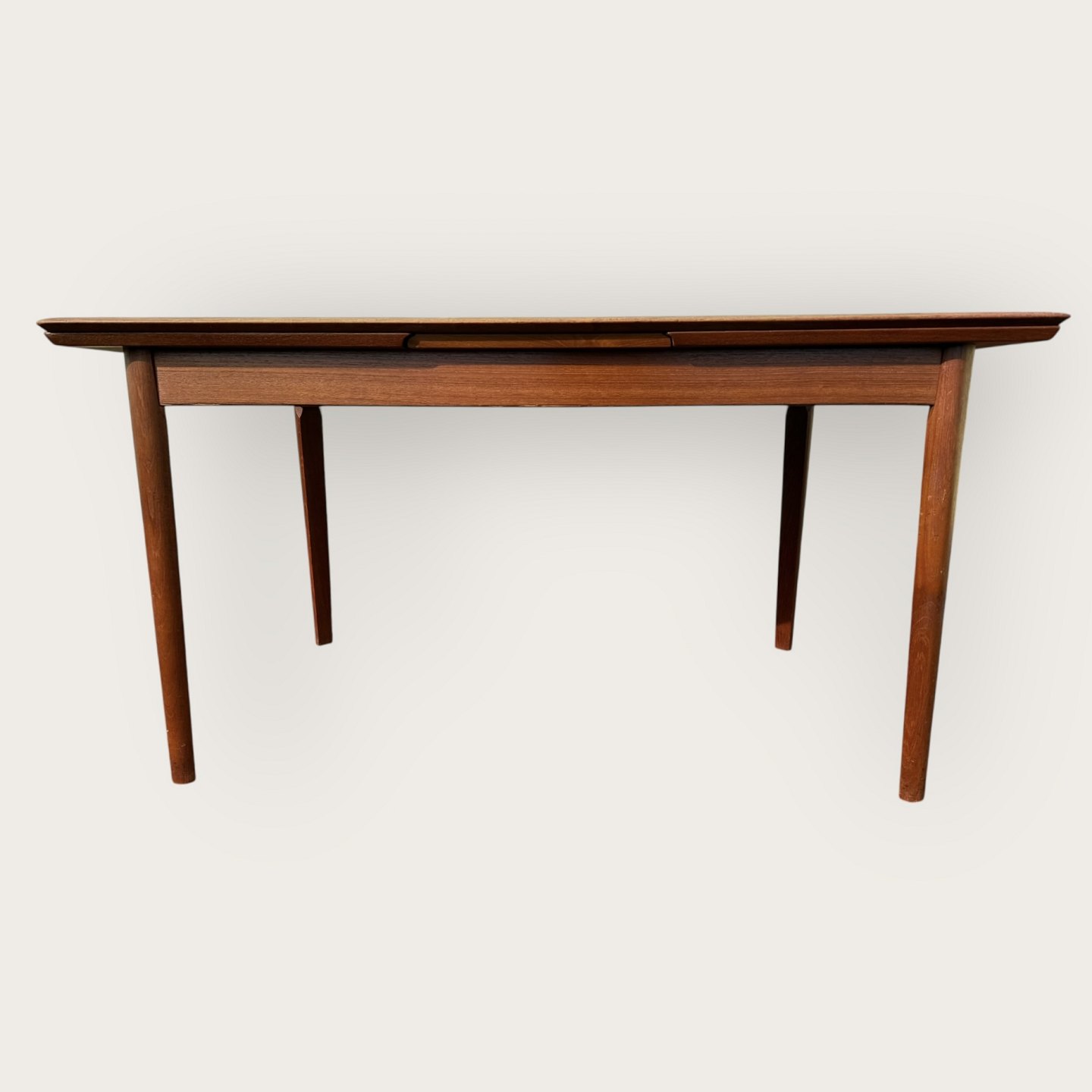 Dining table in teak veneer with solid teak legs, Danish modern from the 1960s, marked with Ellegaards møbelfabrik and EG møbel Silkeborg No 80 (see two photos), Dimensions: HxWxL 73x89x139 (240)cm * Nice used condition*