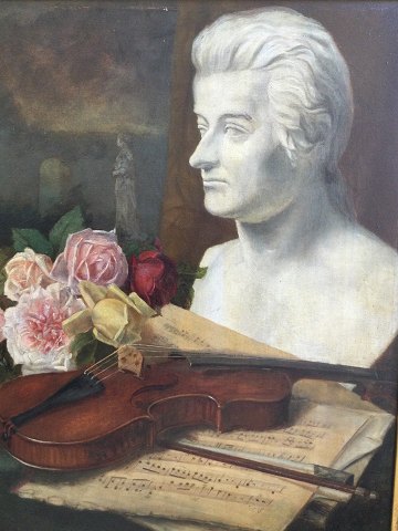 Alice Lynge (19/20 årh): Opstilling på bord med violin, partitur, rosenbuket og buste. Olie på lærred. Sign.: Alice Linge 54x42 (65x53) 24325