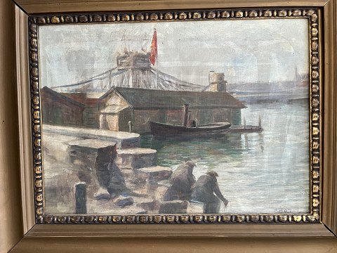 Catharine Heyerdahl (1861-1952): Parti fra Havnen 1907. Olie på lærred monteret på plade. Sign.: CH 07. Bagpå plade betegnet Carl Holsøe - Parti fra Havnen. 29x39 (42x52)