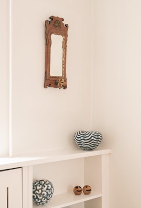 I spisestuen hænger et antikt vægspejl med lysestage i rokoko-stil fra 1880'erne. Rammen af valnød med bladguld reflekterer lyset på en enkel og elegant måde, mens den fine messinglysestage tilføjer en diskret detalje. Spejlet fungerer som et karakterfuldt element, der giver rummet dybde og understøtter helheden i indretningen.