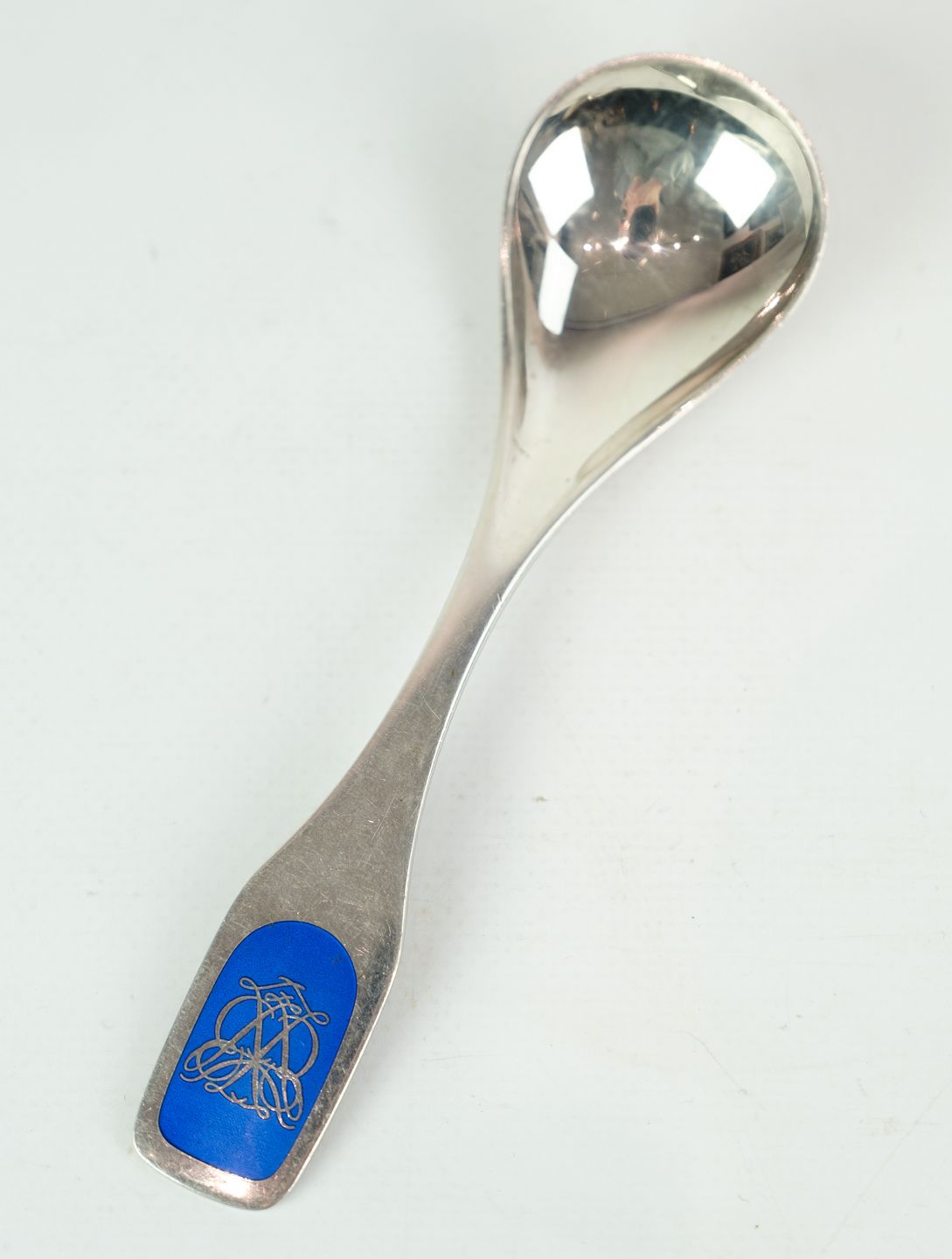 Anniversary spoon from W. & S. Sorensen in 925 sterling silver, Denmark in curtain quality silver with monogram in blue enamel.