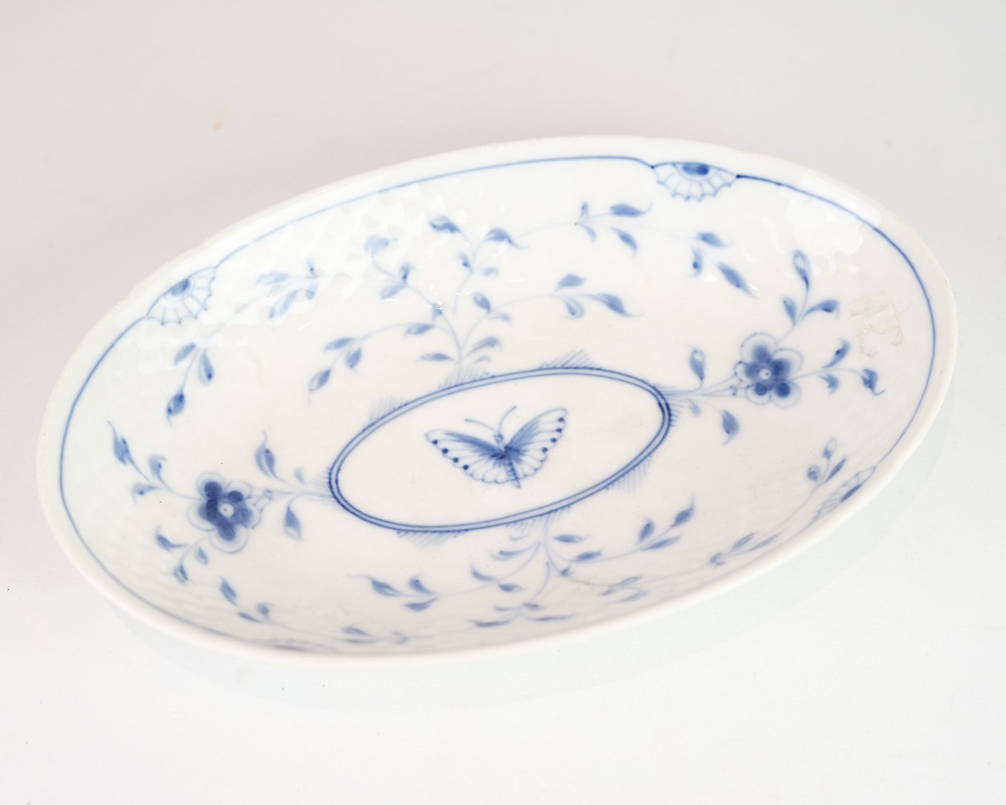 Oval dish no. 39 from Bing & Grondahl, made of porcelain with hand-painted butterfly motif. A classic serving dish with original stamp under the bottom.