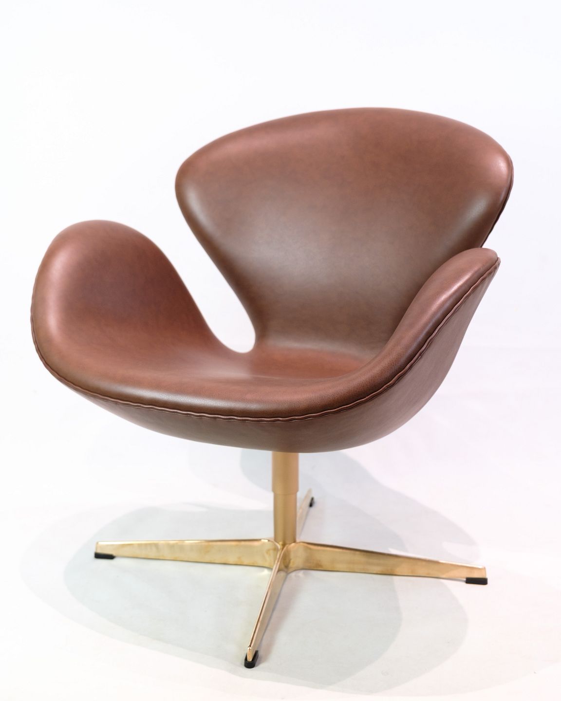 Please contact us for price informationThe Swan, model 3320 manufactured by Fritz Hansen and designed by Arne Jacobsen. It is upholstered with high quality brown leather and has an original 60th anniversary gold column. It is in very good condition.