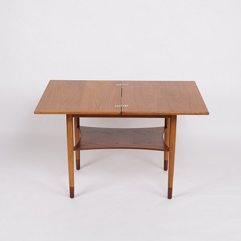 Sofabord designet af Severin Hansen i palisander, produceret af Haslev Møbelsnedkeri i samarbejde med Royal Copenhagen. Bordpladen er indlagt med keramiske “Baca” fliser af Nils Thorsson – hver med sit unikke udtryk i blå og jordfarvede nuancer. Bordet forener dansk snedkerhåndværk og kunstnerisk keramik i en raffineret helhed, og de karakteristiske smigforbindelser vidner om stor præcision i udførelsen.