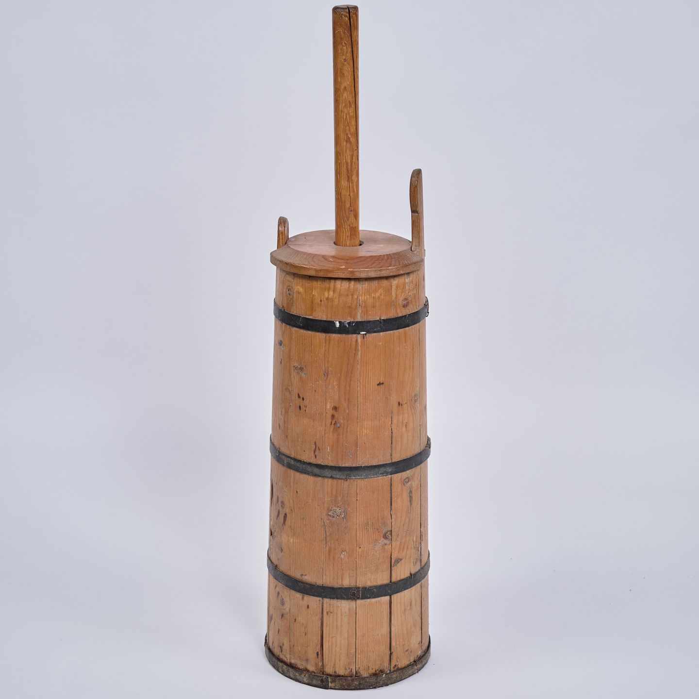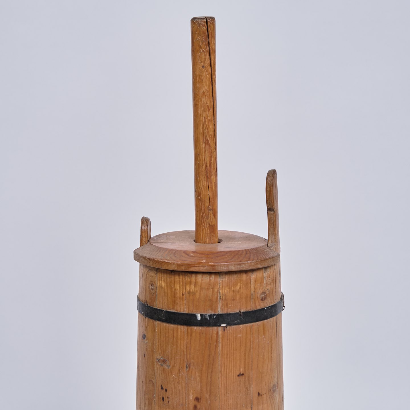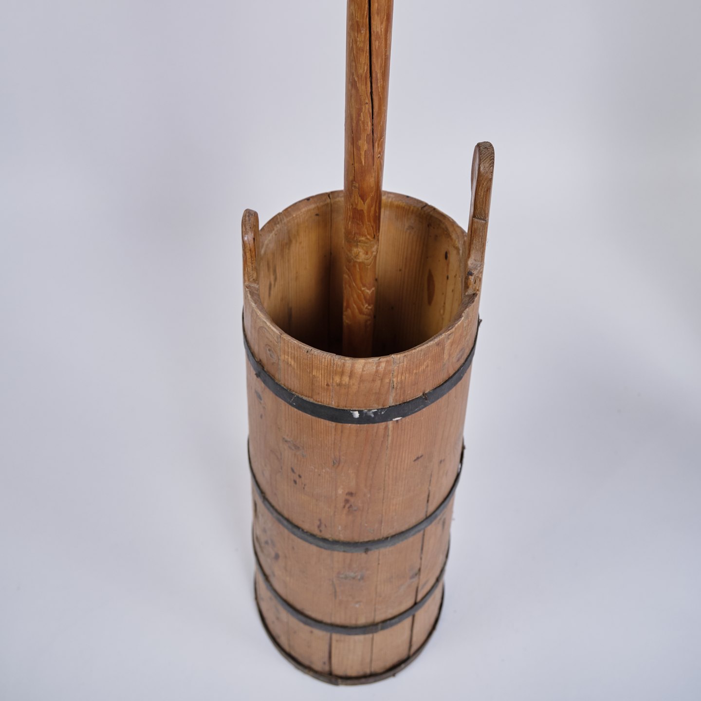 Antique butter grinder from the 1860s. Made of oak with steel details. Height 100 cm, diameter 25 cm. Possibly used as an umbrella holder.