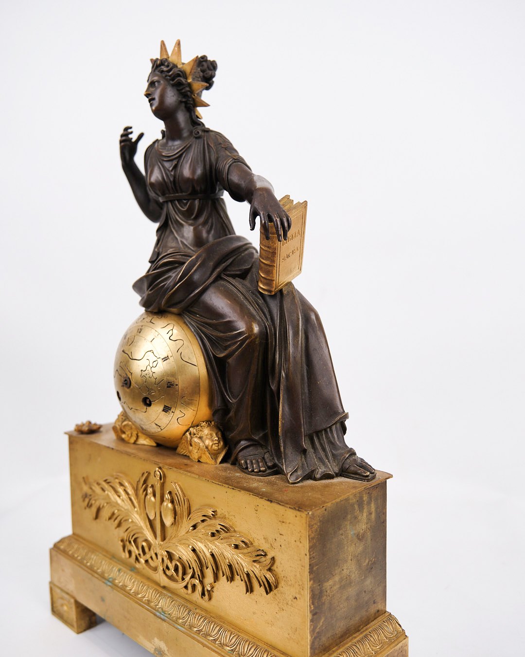 Fransk Kaminur - Bronze - Udsmykket Med Kvindefigur med strålekrone og bog - Paris - År 1820erne