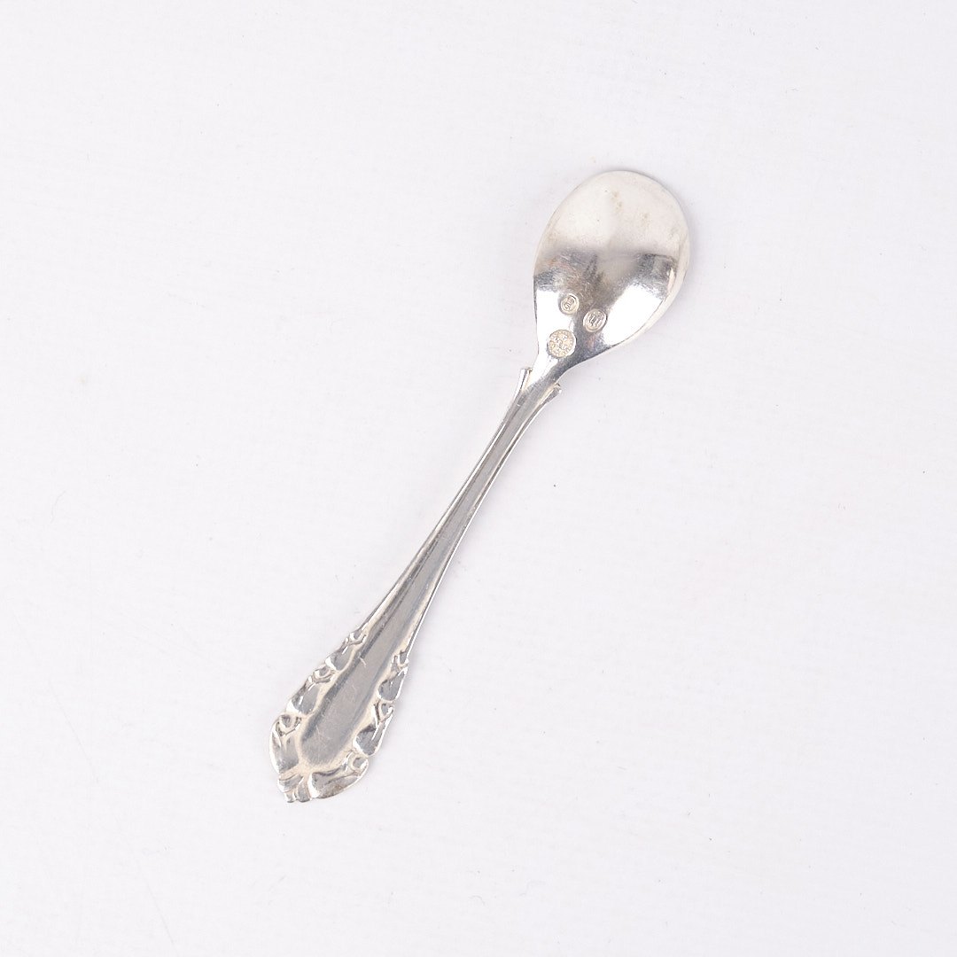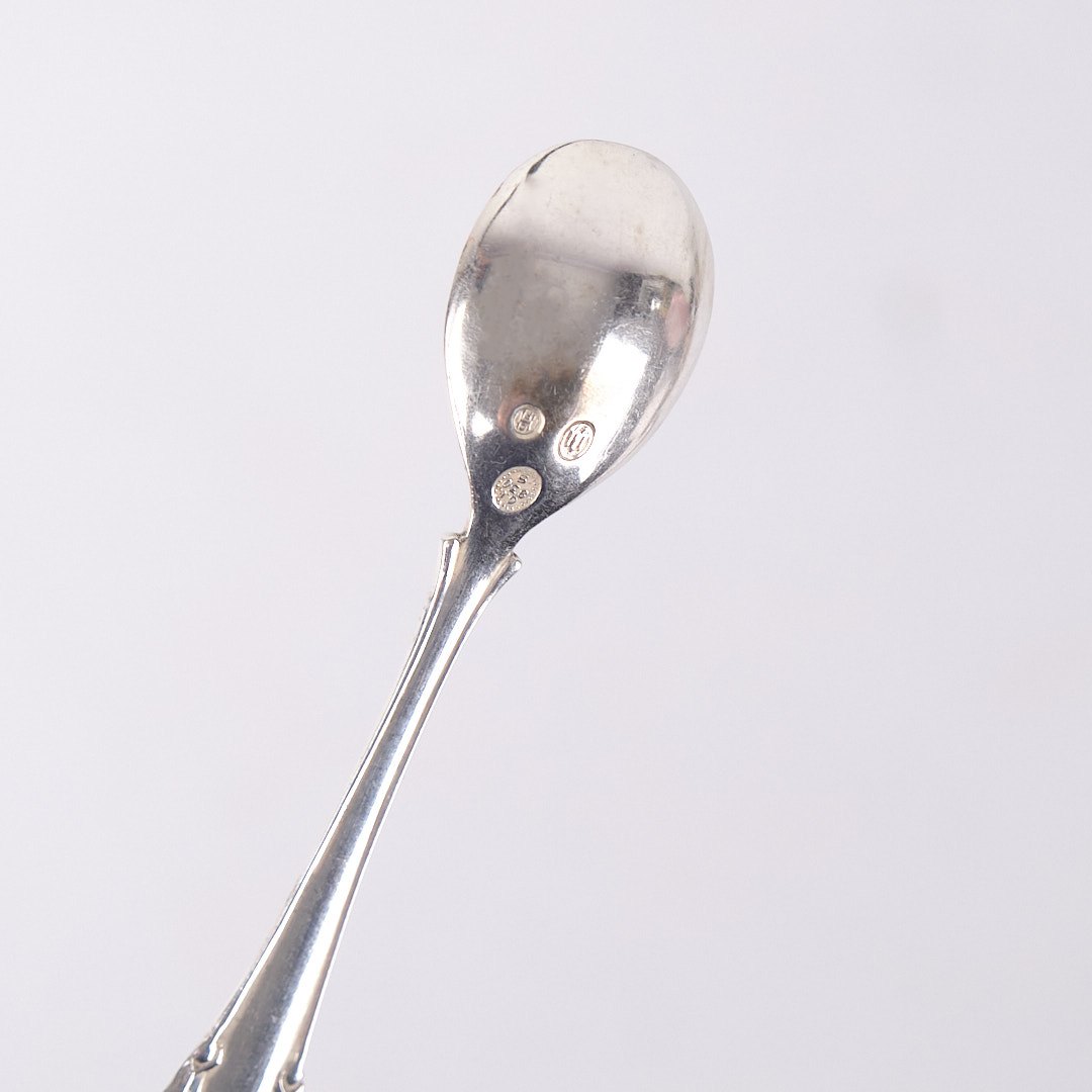Saltske i sølv fra Georg Jensen, udført i det elegante Liljekonval (Lily of the Valley) mønster. Skeen er stemplet og udformet med bløde linjer og naturlige blomsterdetaljer, der kendetegner Georg Jensens organiske designstil.