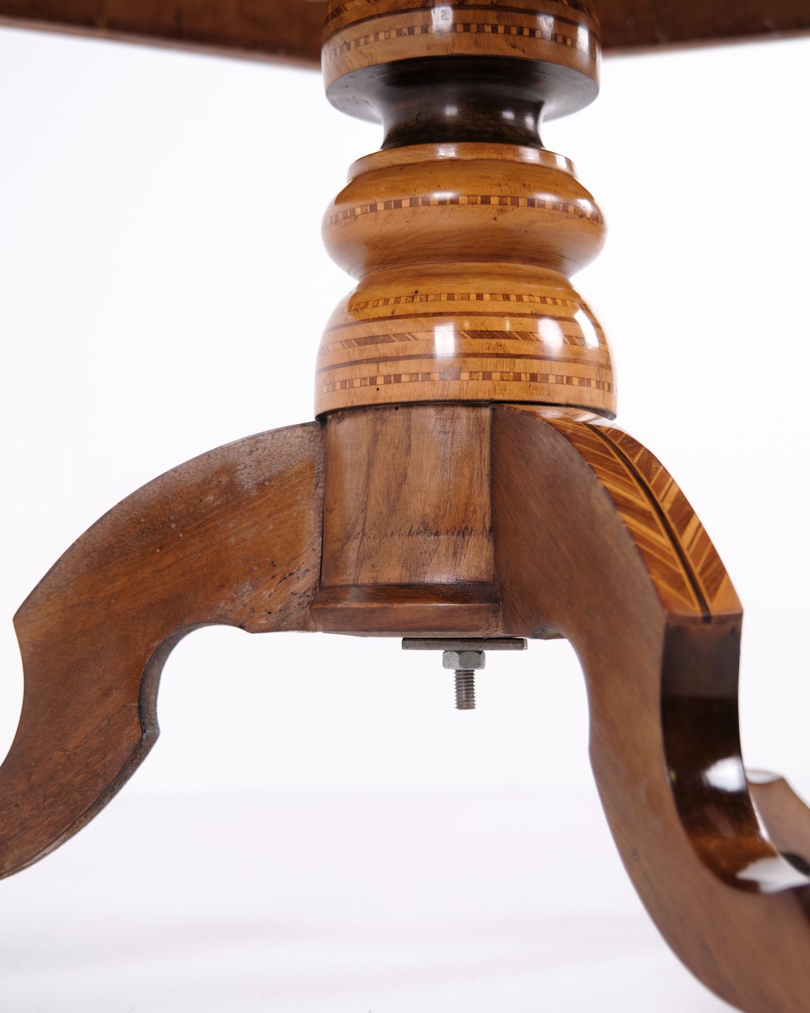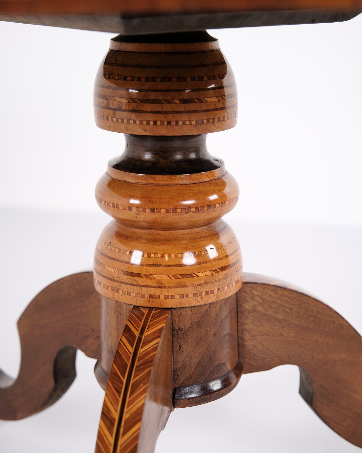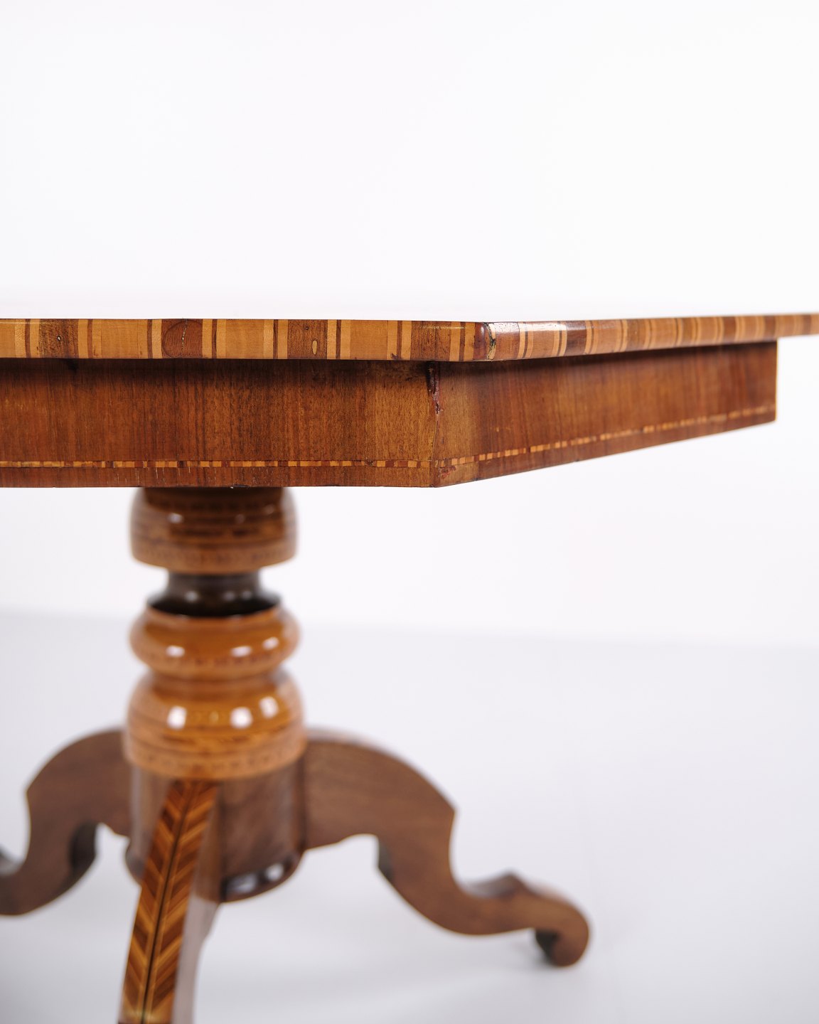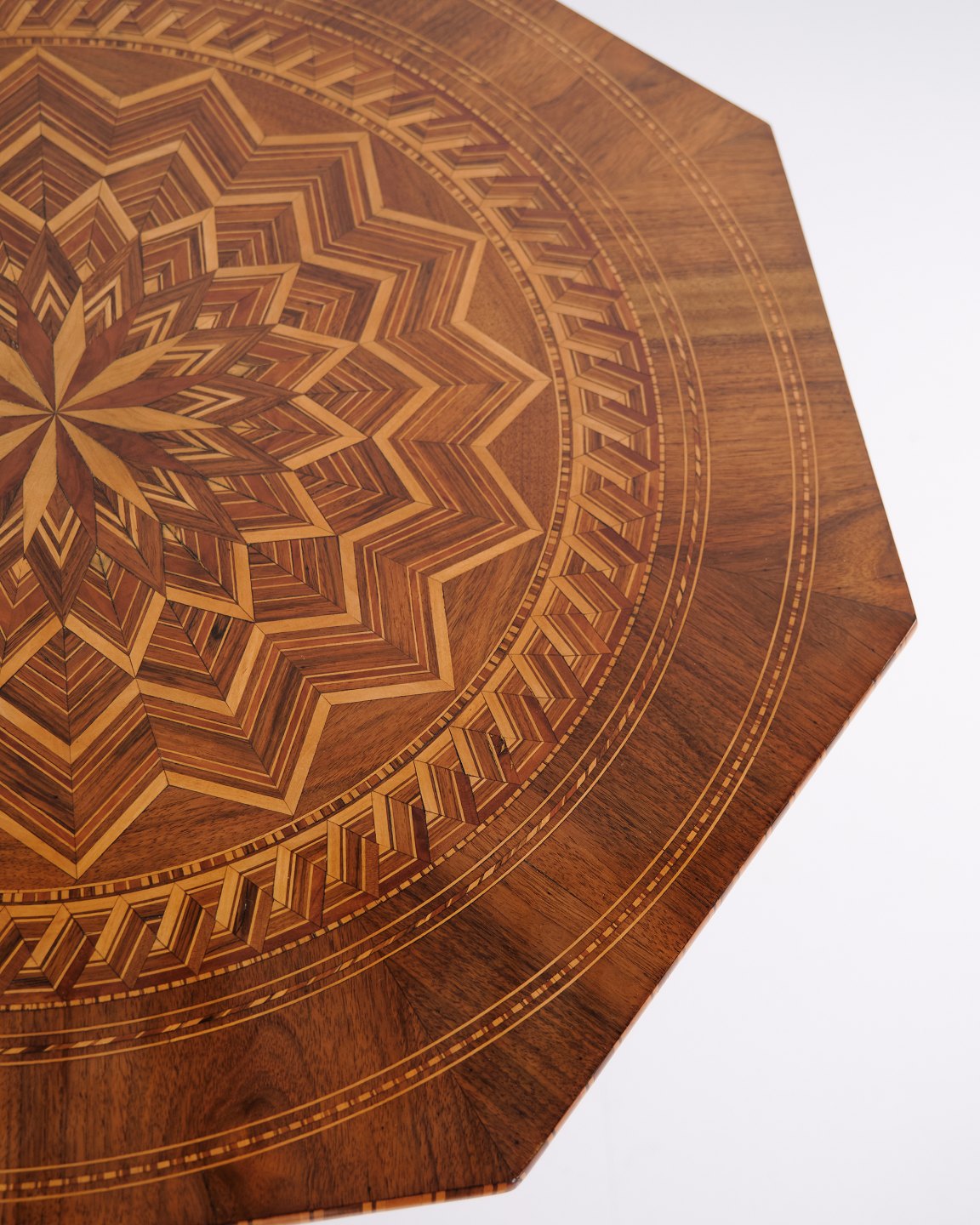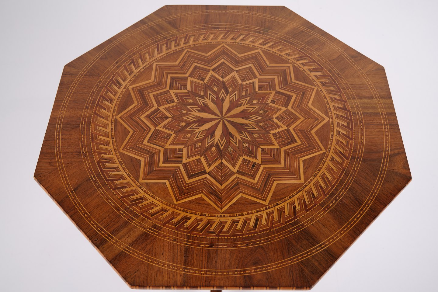 Ottekantet søjlebord fra Italien, dateret til 1850’erne. Bordet er rigt udsmykket med håndlagt intarsia, der fremhæver de geometriske former og det dekorative helhedsudtryk.