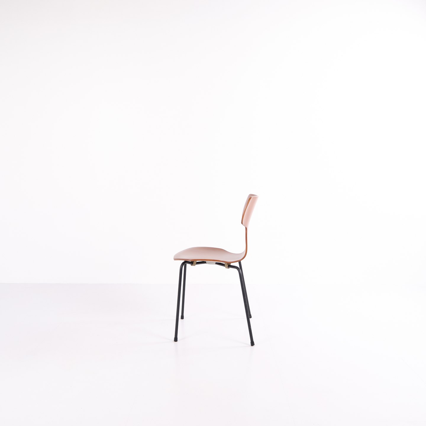 Sæt af seks spisestuestole, model 3103, også kaldet T-stolen eller Hammerstolen, fra Fritz Hansen. Stolene er professionelt behandlet og restaureret på vores værksted og fremstår i flot stand. Udstyret med originale Fritz Hansen- og Danish Control-labels, som dokumenterer ægthed og produktion.