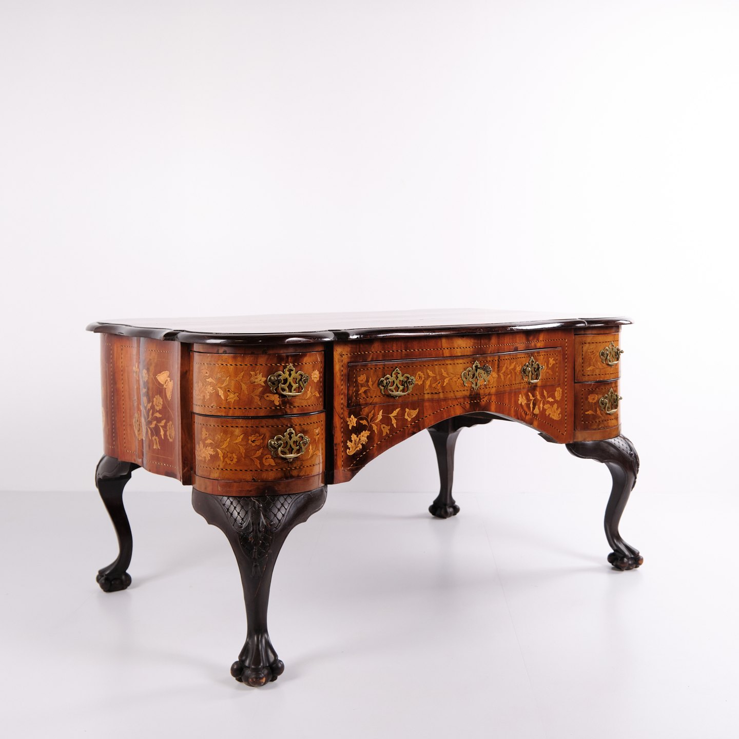 Skrivebord fra ca. 1860, udført i nøddetræ med detaljeret frugttræ-intarsia på både top og sider. Bordet er håndpoleret med shellak, hvilket giver en dyb glød og fremhæver det fine håndværk. Et elegant antikt møbel med rige dekorationer og solide materialer.