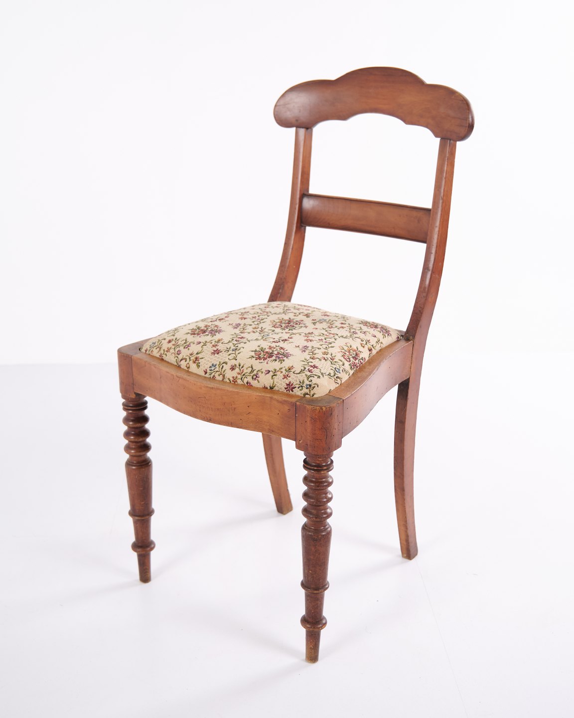 Spisebords- eller entréstol i sen Empire stil, udført i mahogni og polstret med blomstret stof. Klassisk design med tidstypiske linjer og let buet ryg. En dekorativ stol, der egner sig til både spiseområde og entré.