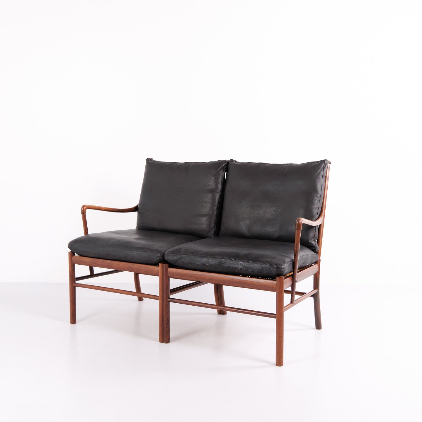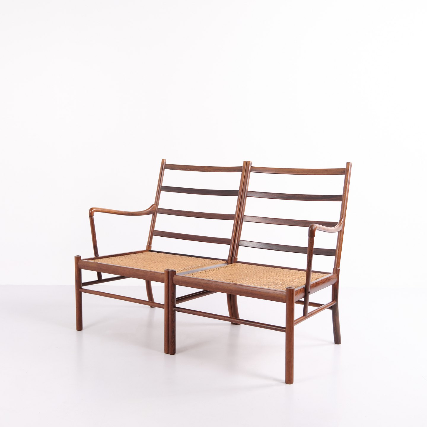 Colonial 2-pers. sofa, model OW149-2, designet af Ole Wanscher og fremstillet af P. Jeppesen omkring 1960. Udført i palisander med flettet sæde og løse hynder. Ole Wanscher var en central skikkelse i dansk møbeldesign og kendt for sit elegante, klassisk inspirerede formsprog. P. Jeppesen var hans faste producent gennem flere årtier og stod for en særligt høj håndværkskvalitet, der gjorde Wanschers møbler eftertragtede både i samtiden og i dag. Colonial-serien er blandt hans mest ikoniske værker.