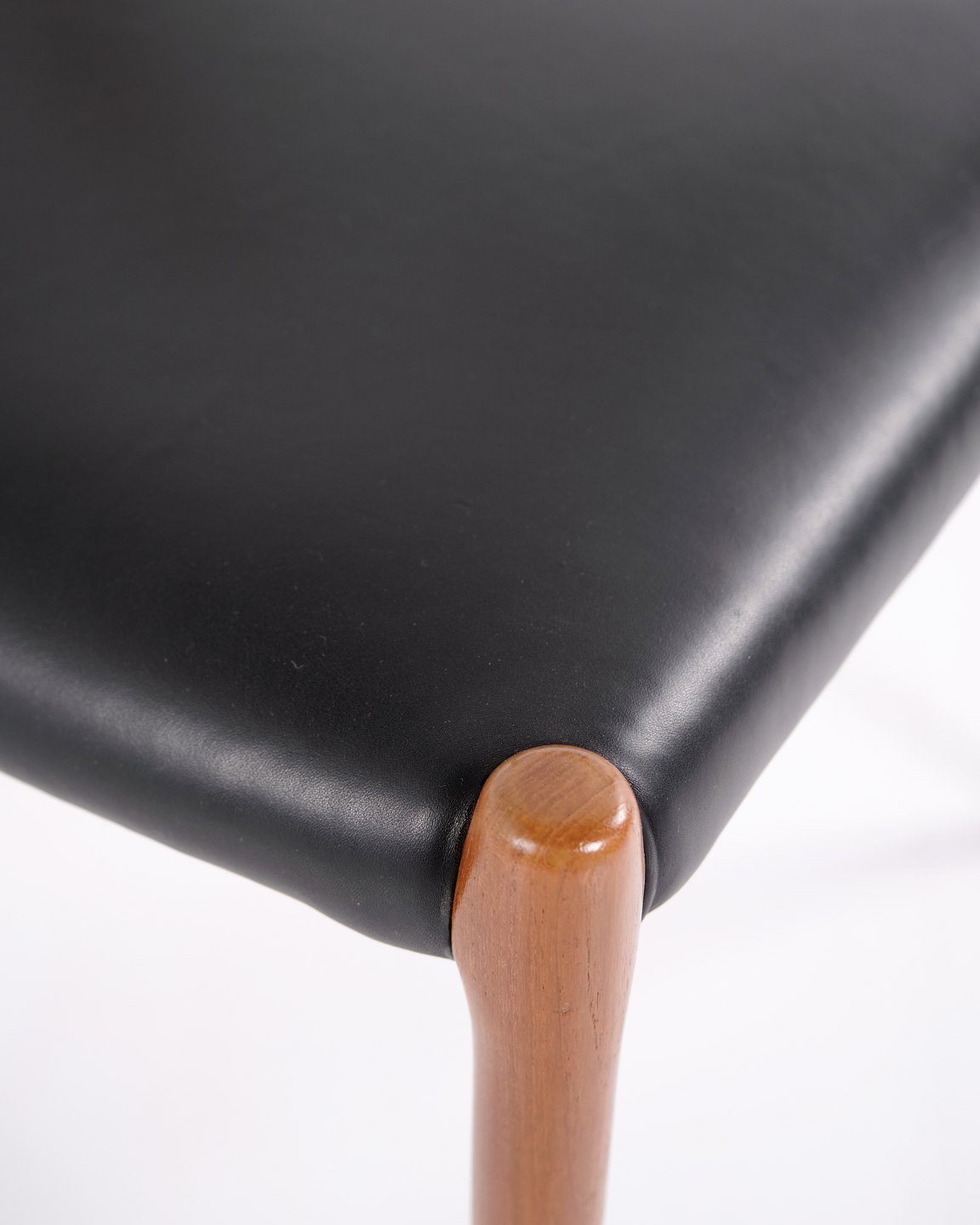 Spisebordsstol model 79, designet af Niels Otto Møller og fremstillet af JL Møllers Møbelfabrik i 1960’erne. Udført i teak med sort lædersæde. Et klassisk Møller-design, kendt for høj håndværkskvalitet og elegant form.