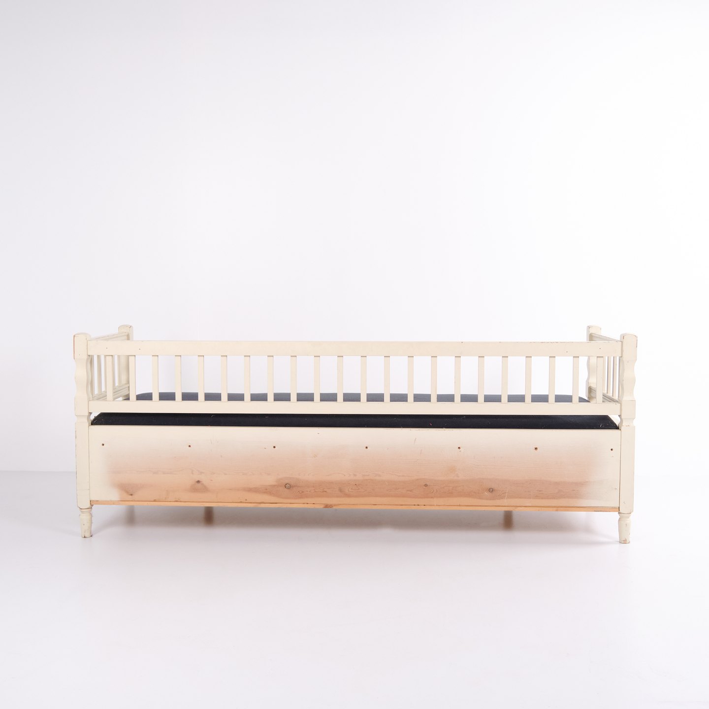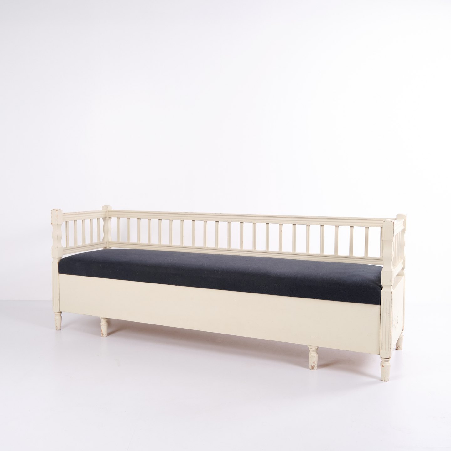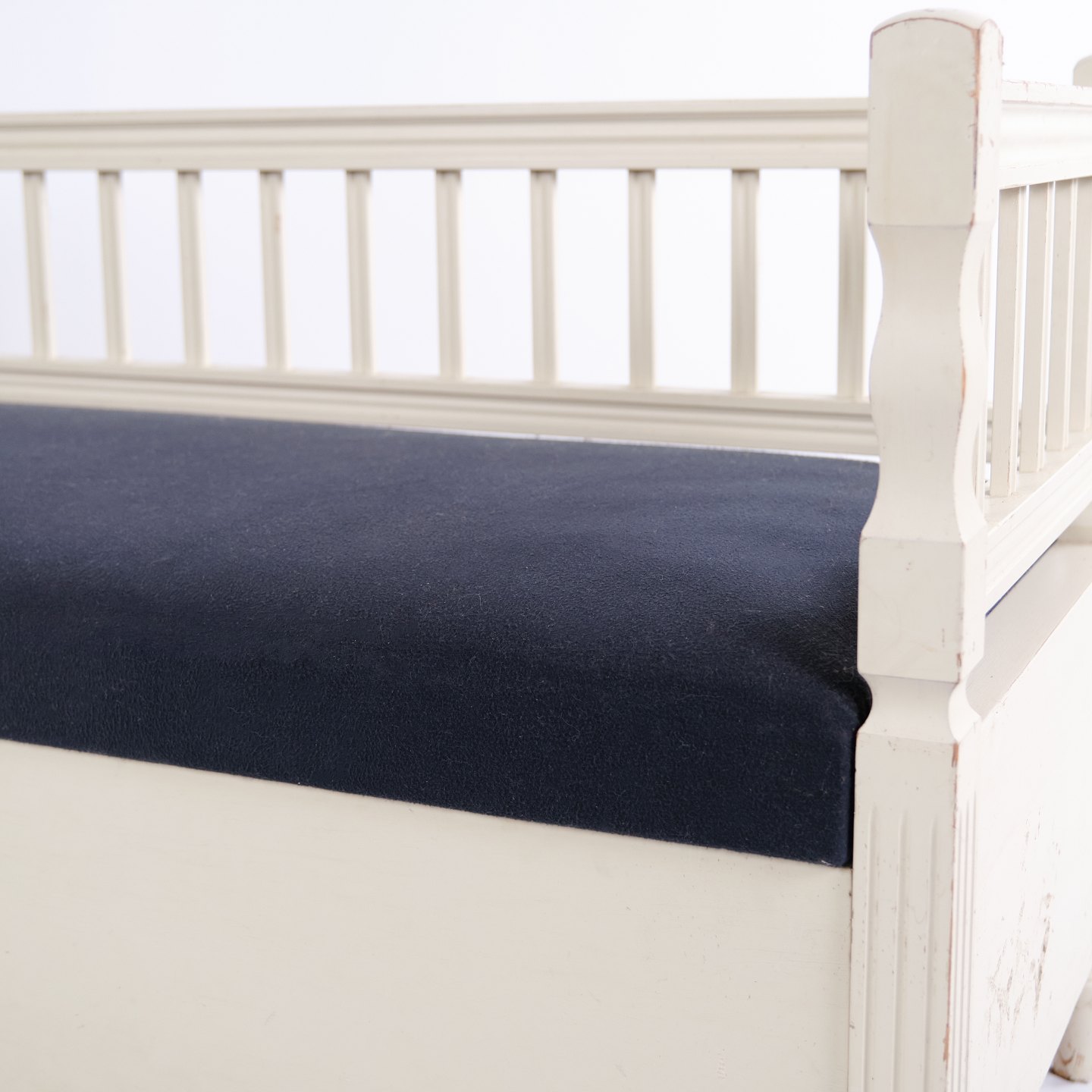 Antique storage bench in Gustavian style from around 1890. White painted with upholstered seat. Classic piece with patina and charm.