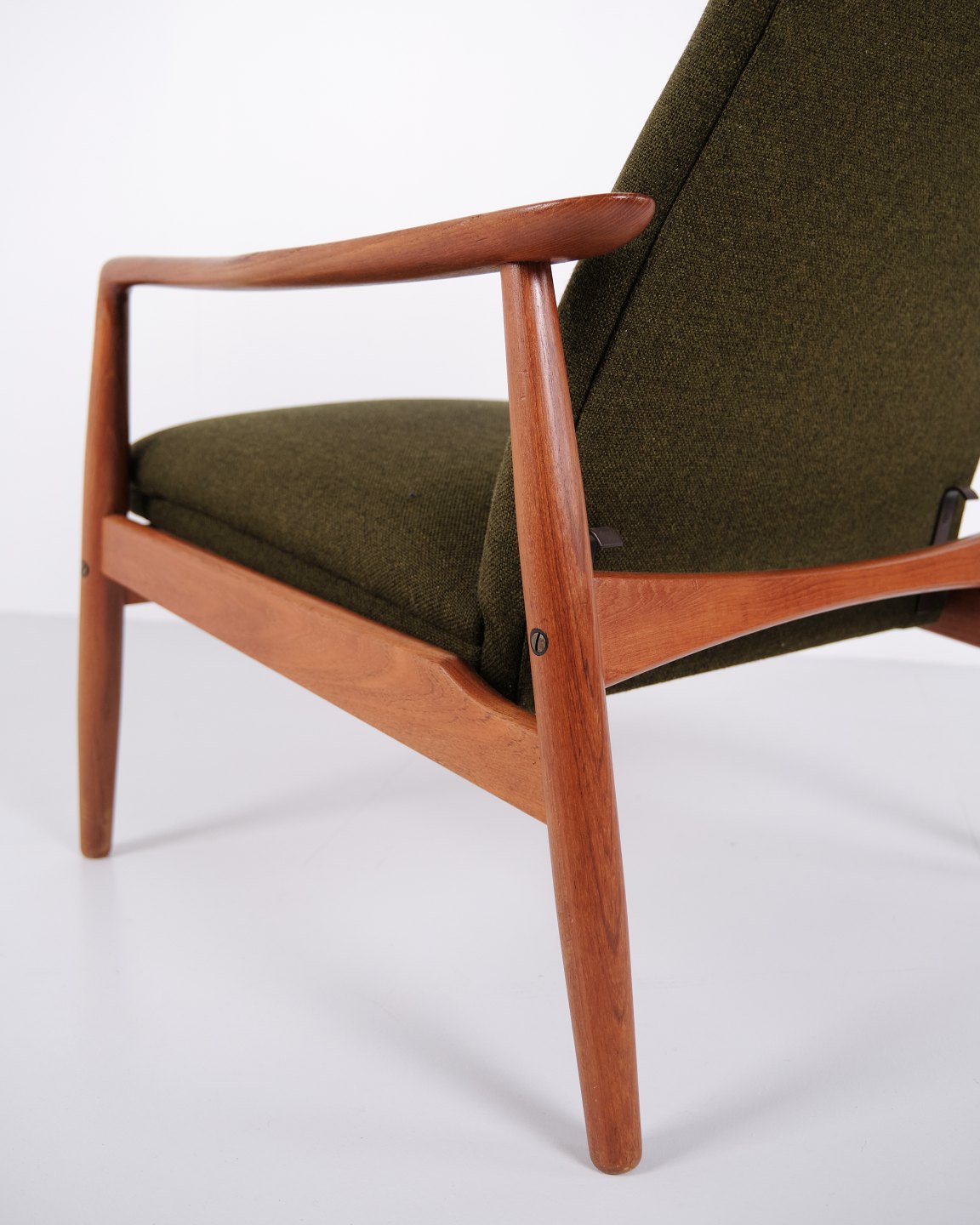 Et par hvilestole med skammel designet af Alf Svensson for Fritz Hansen. Teaktræ og grønt stof. Skandinavisk design fra 1960’erne med fokus på komfort.