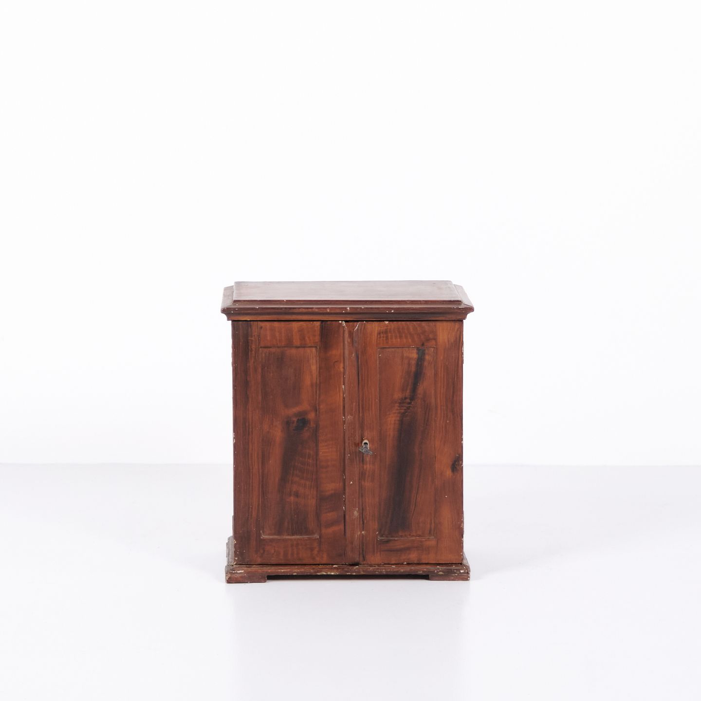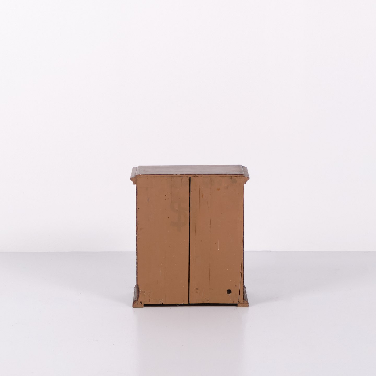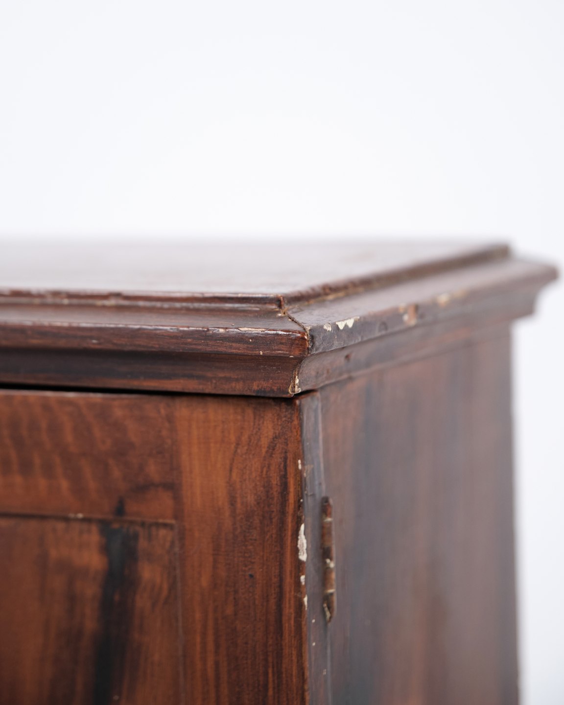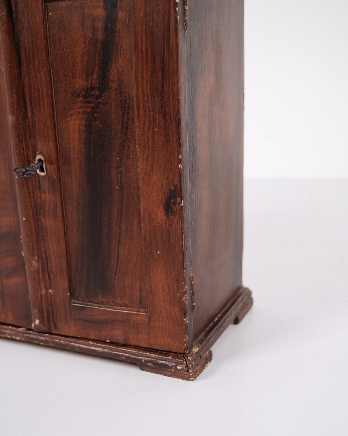 Antikt miniaturemøbel i egetræ med håndsmedede beslag fra 1840’erne. Unikt og dekorativt samlerobjekt med historisk karakter.