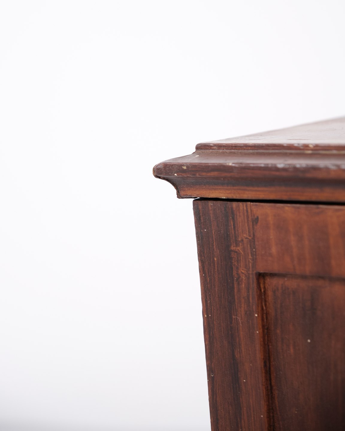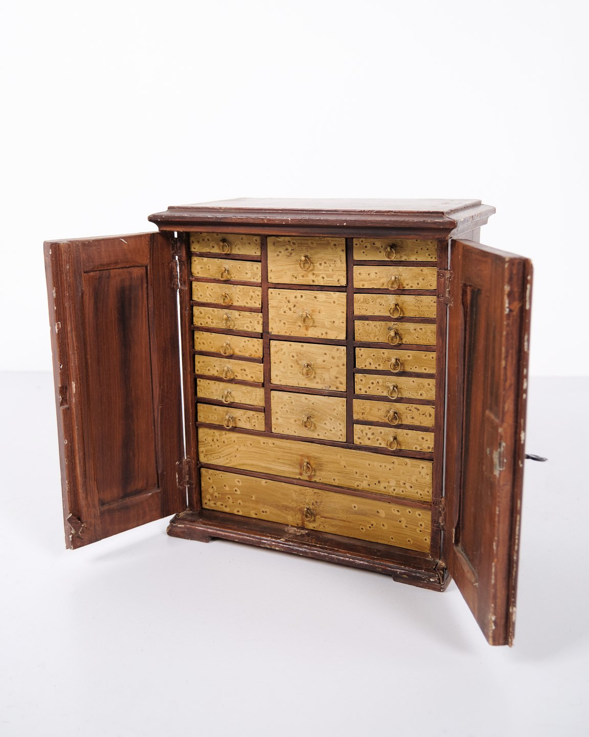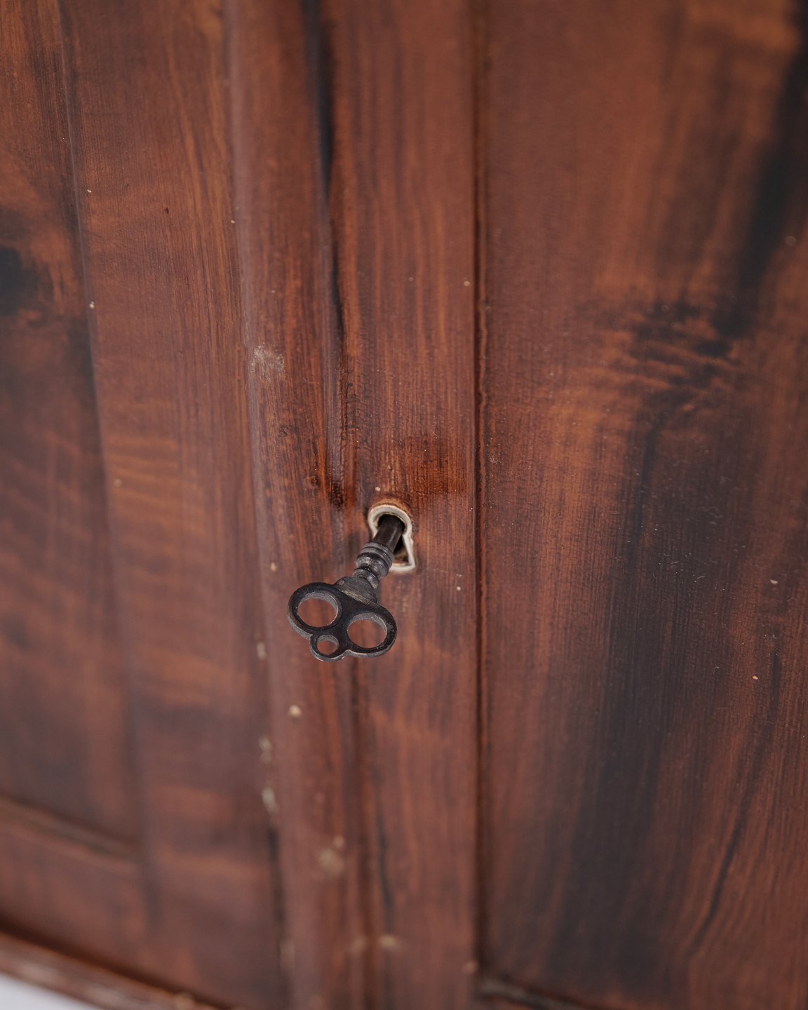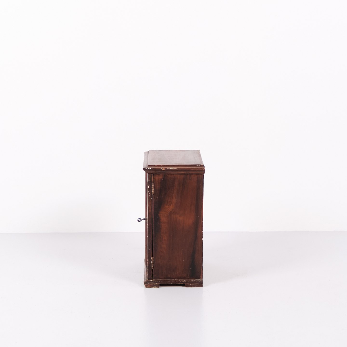 Antikt miniaturemøbel i egetræ med håndsmedede beslag fra 1840’erne. Unikt og dekorativt samlerobjekt med historisk karakter.