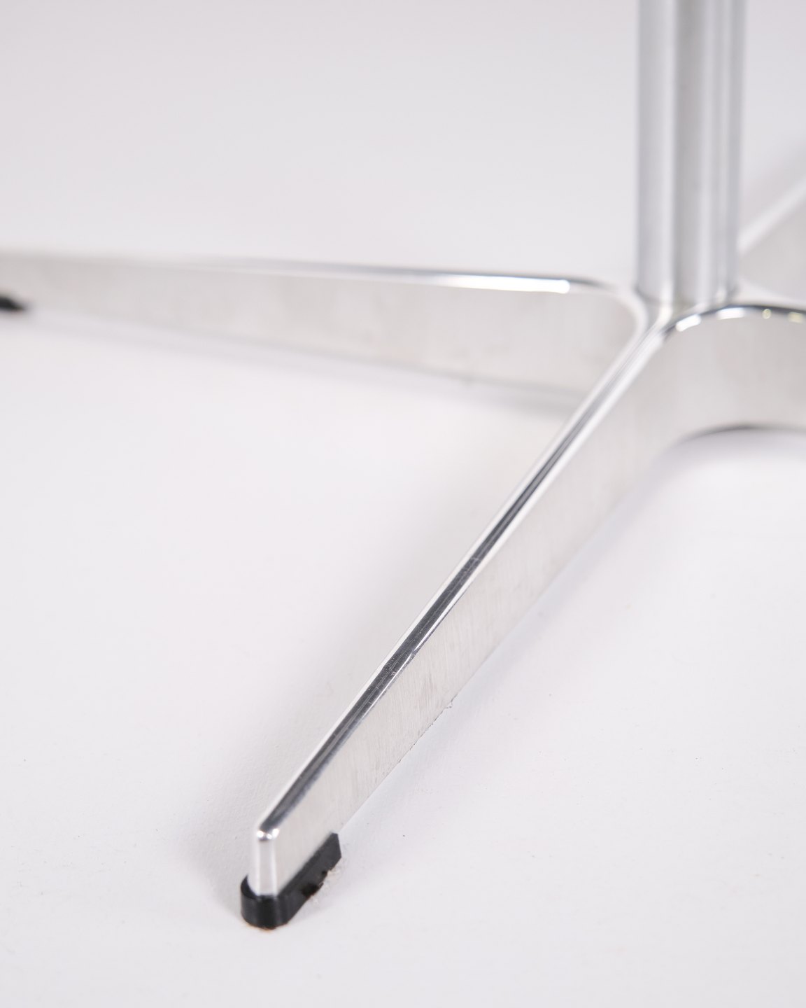 Dette eksemplar er fremstillet hos Fritz Hansen i 2023 og er udført med stel i aluminium og bordplade i sort laminat. Bordet fremstår som et nutidigt eksempel på det klassiske danske design.