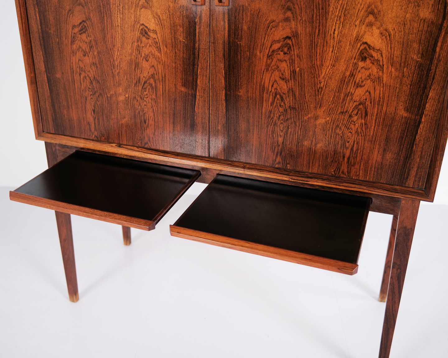 Skabet er indrettet med praktiske opbevaringsmuligheder, herunder udtrækshylder i fronten samt en justerbar hylde i skabets indre. Møblet fremstår med en flot palisanderfinér og bærer Bornholm Møbelfabriks stempel samt modelnummer på bagsiden.